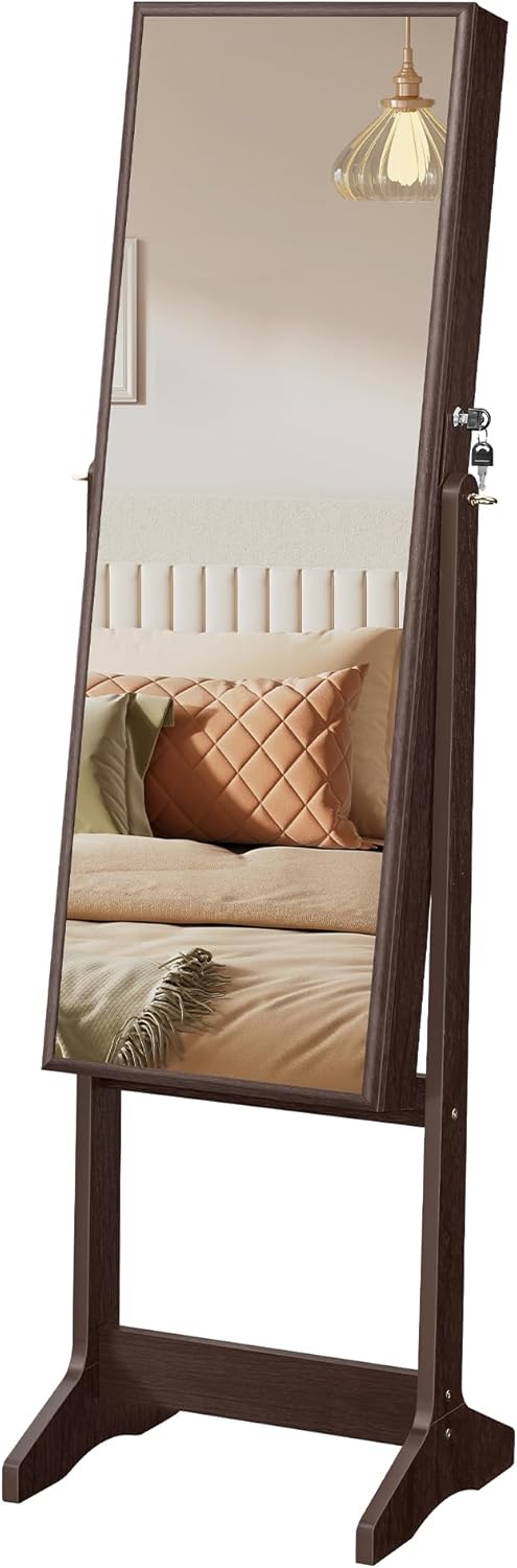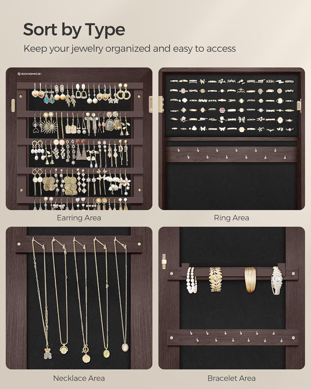 SONGMICS Mirror Jewelry Cabinet Armoire, Standing Full-Length Mirror, Lockable Jewelry Organizer, Gift Idea, Brown Surface and Black Lining UJJC69BR
