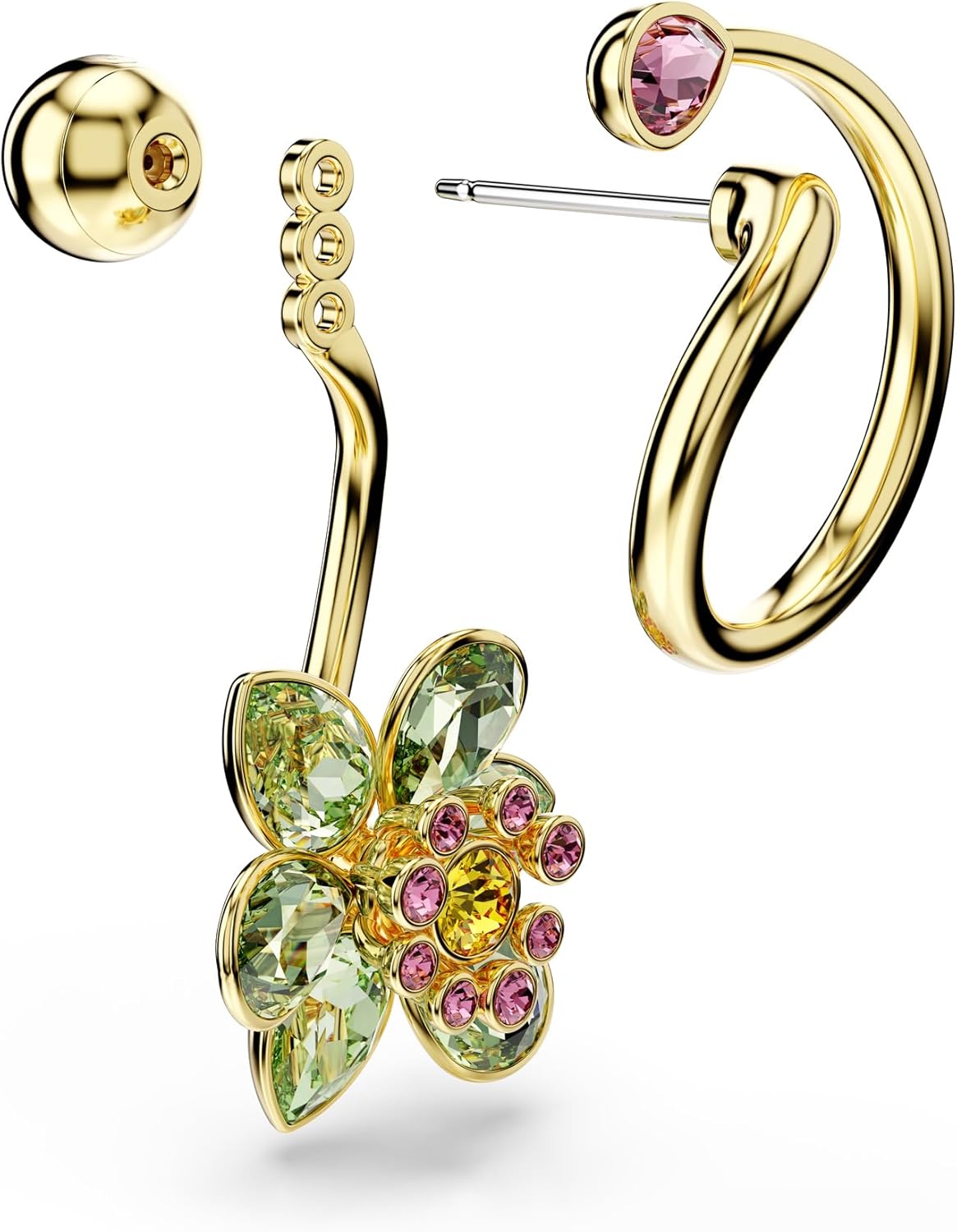 Swarovski Idyllia drop earrings, Asymmetrical design, Mixed cuts, Flower, Multicolored, Gold-tone finish