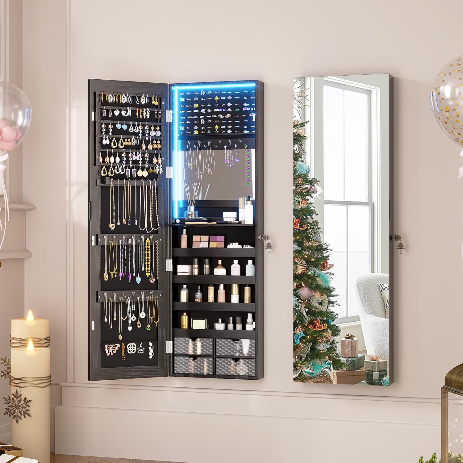 [Lock with 2 Christmas Keys] Give the gift of elegance and security! Organize and secure your valuables with this elegant lockable jewelry mirror cabinet. Featuring 2 unique keys, it ensures your treasures stay safe, and be a thoughtful present for loved ones