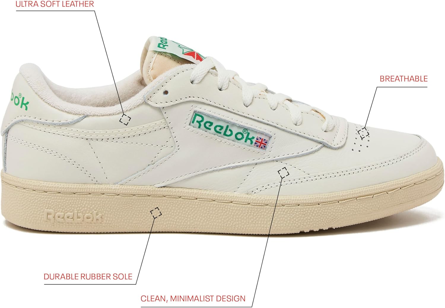 Club C 85 Vintage silhouette Leather upper Padded collar Perforated toe box Reebok logo patch on tongue Reebok branding patch on side panels Reebok branding on rear Flat cotton laces Removable EVA foam sock liner EVA midsole Rubber outsole Style: RKDV6434 Color: Chalk / Paper White / Glen Green Material: Leather