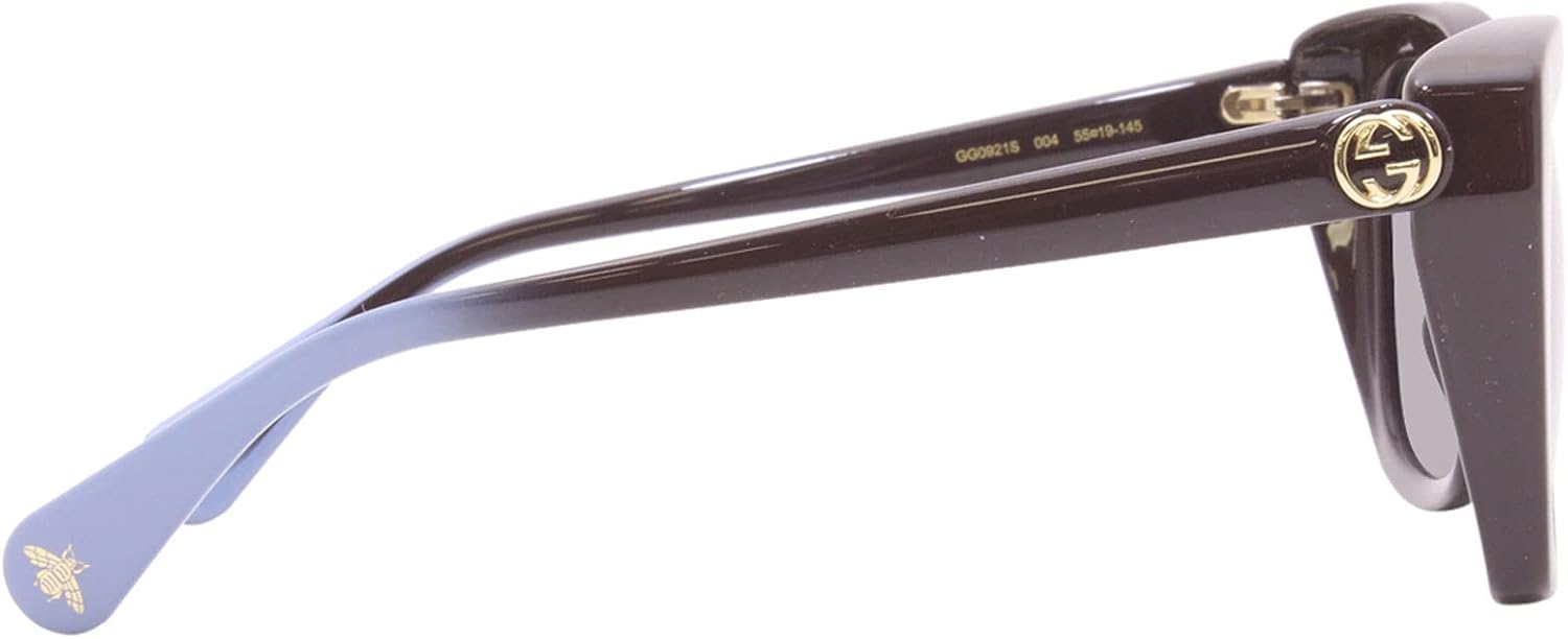 Gucci GG0921O sunglasses includes the Gucci logo on the temple. This Gucci GG0921O acetate full rim rectangular shape sunglasses made for women. New shapes in a classic carry-over story, combining trendy looks with refined touches. Classic and elegant rectangular shape featuring solid front and gradient temples combining classic and fresher tones. Gucci Interlocking Logo and Bumble Bee on end tips.