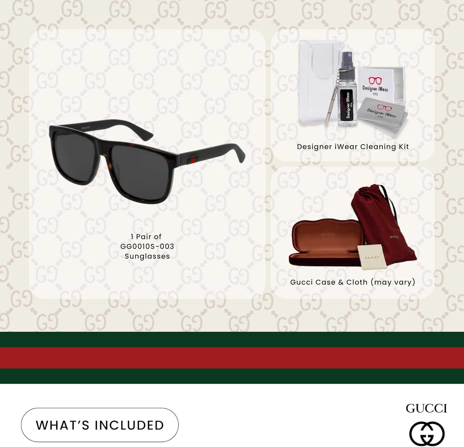 Gucci GG0010S Square Sunglasses For Men For Women + BUNDLE with Designer iWear Eyewear Care Kit