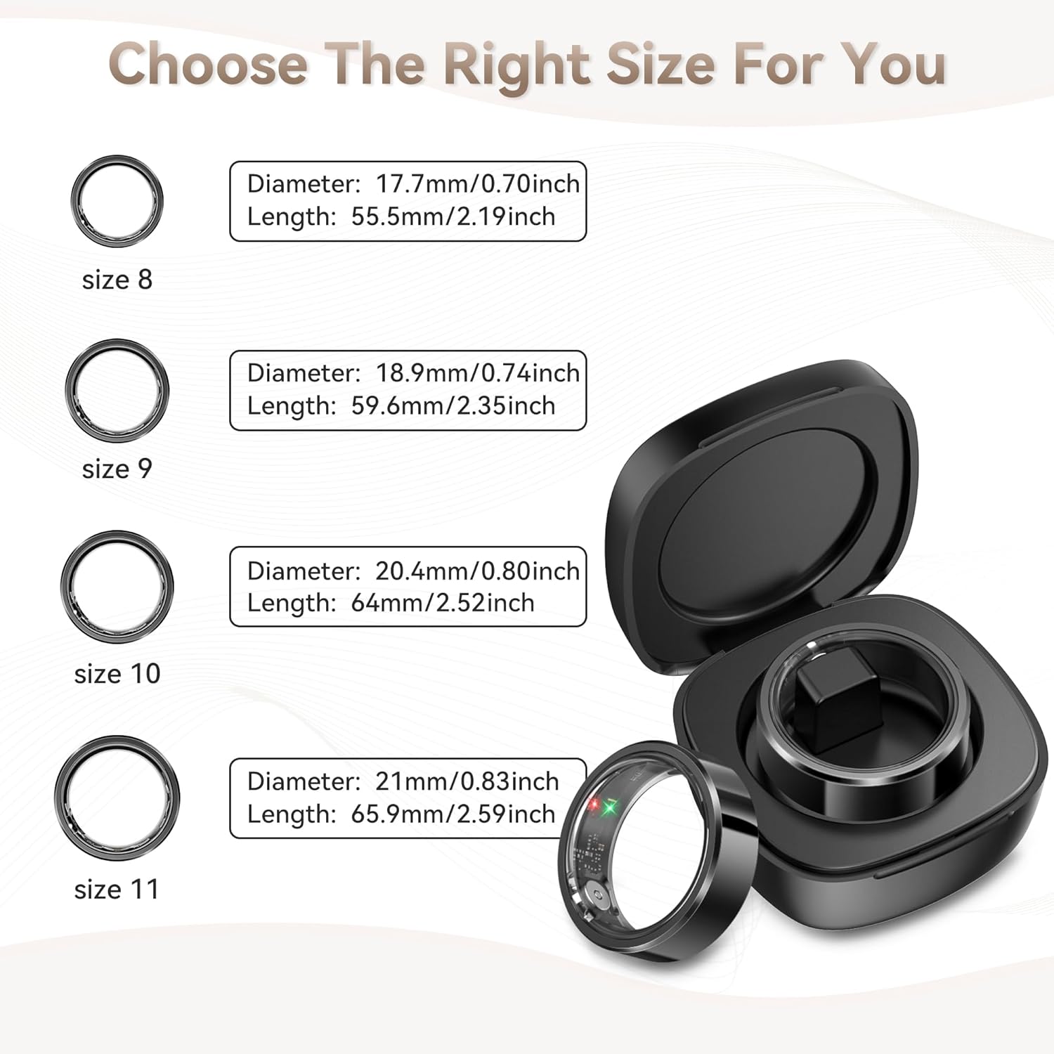 【Various Size & Perfect Gift】This fitness smart ring is available in a variety of sizes. You can choose the size that best suits you by measuring the circumference of your finger and referring to our size recommendations. No matter which size you choose, its thin and light design will ensure that you will hardly feel it when wearing it. The ring has a sophisticated and fashionable appearance, making it an ideal gift for your partner, family or friends.
