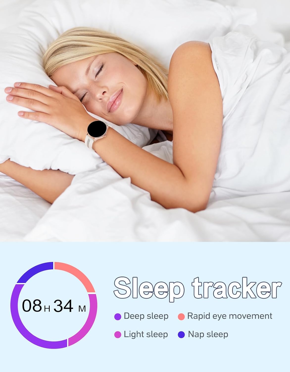 【Heart Rate Monitor & Sleep Tracker】This health tracker watch can auto monitor your heart rate to help you to keep an eye on your health metrics (real-time heart rate, blood oxygen level, respiration rate). Also, it provides a detailed analysis of your sleep quality by continuously recording your sleep stages.