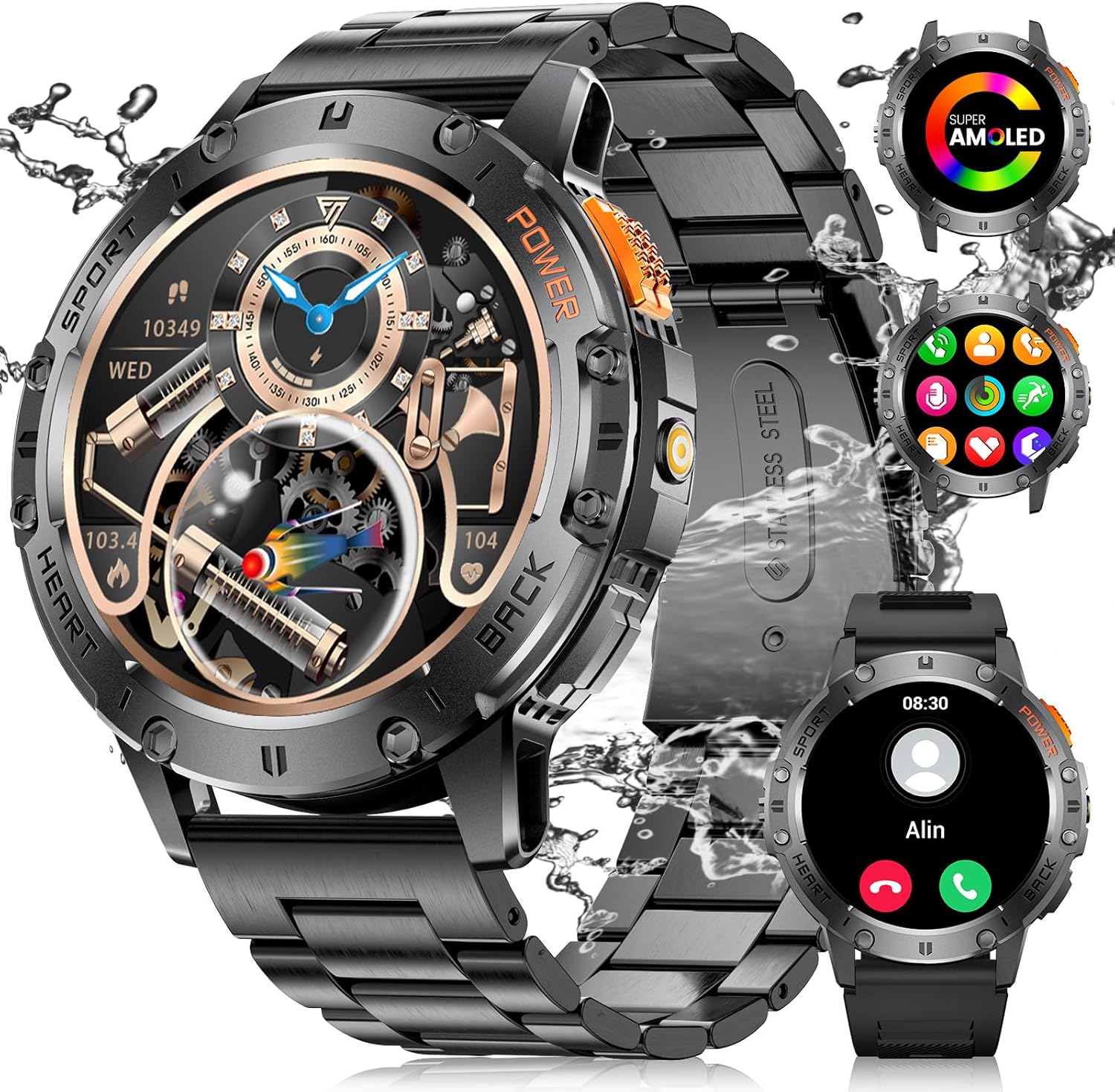 【Stunning AMOLED Display & Always-On-Display】: The 466*466 resolution HD AMOLED screen provides sharp, vibrant visuals, ensuring you see every detail clearly, whether indoors or out.The military smart watches for men are designed for those who value clarity and style in a sleek timepiece.The “Always-On-Display” function allows you to check the time without lifting your hand or touching the screen. (Note: Enabling this feature will increase battery consumption)