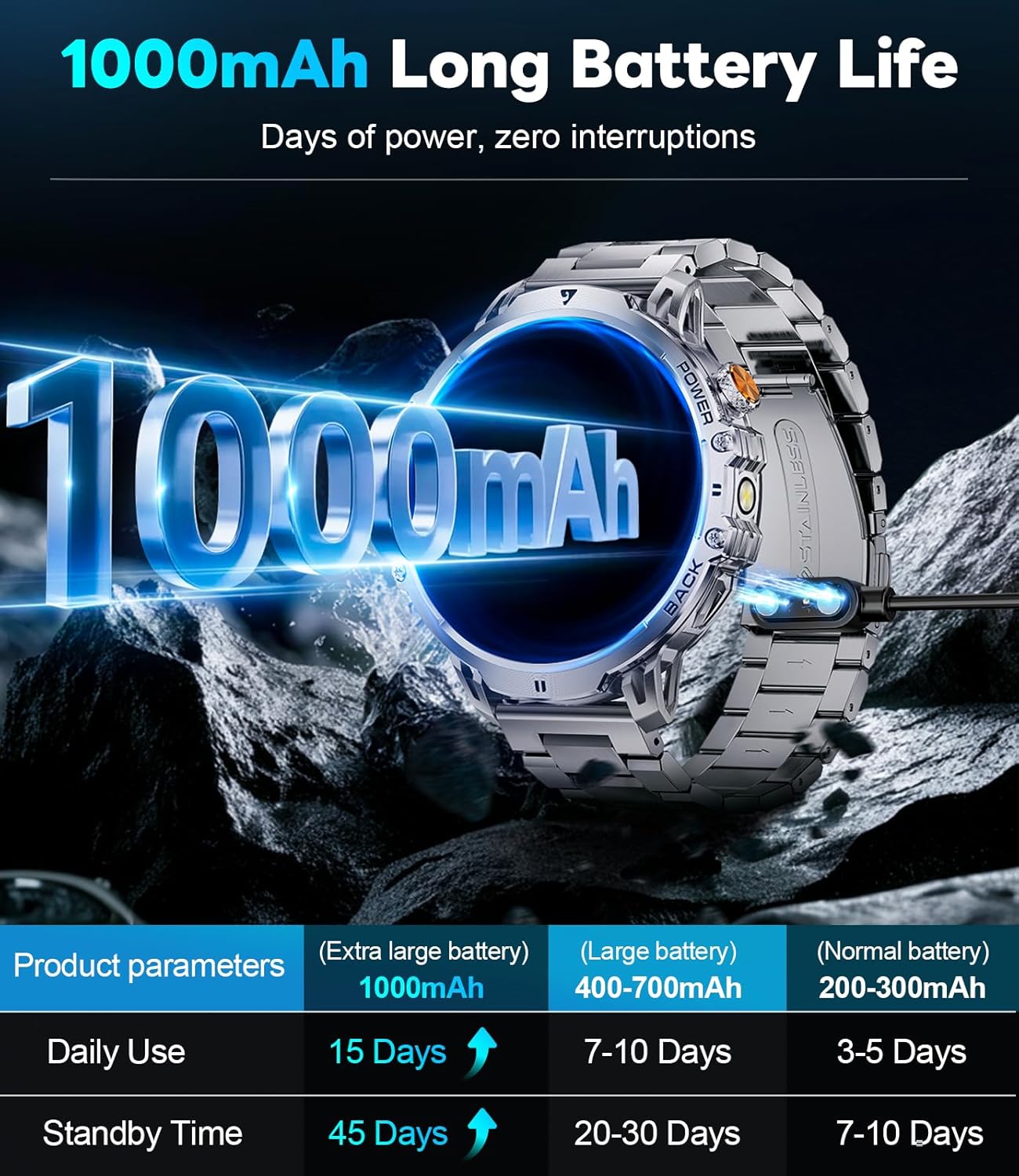 【1000mAh High-Endurance Battery, 50+ Days Ultra-Long Standby】 Smart watch Equipped with an efficient 1000mAh lithium-ion battery, this smartwatch ensures outstanding battery life. Under normal operating conditions, it lasts 14+ days on a single charge, with a maximum standby time of 50+ days, meeting your long-term wearing needs without frequent charging. watches for men features magnetic charging technology, taking only 2.5 hours for a full charge, providing a simple and reliable charging experience.
