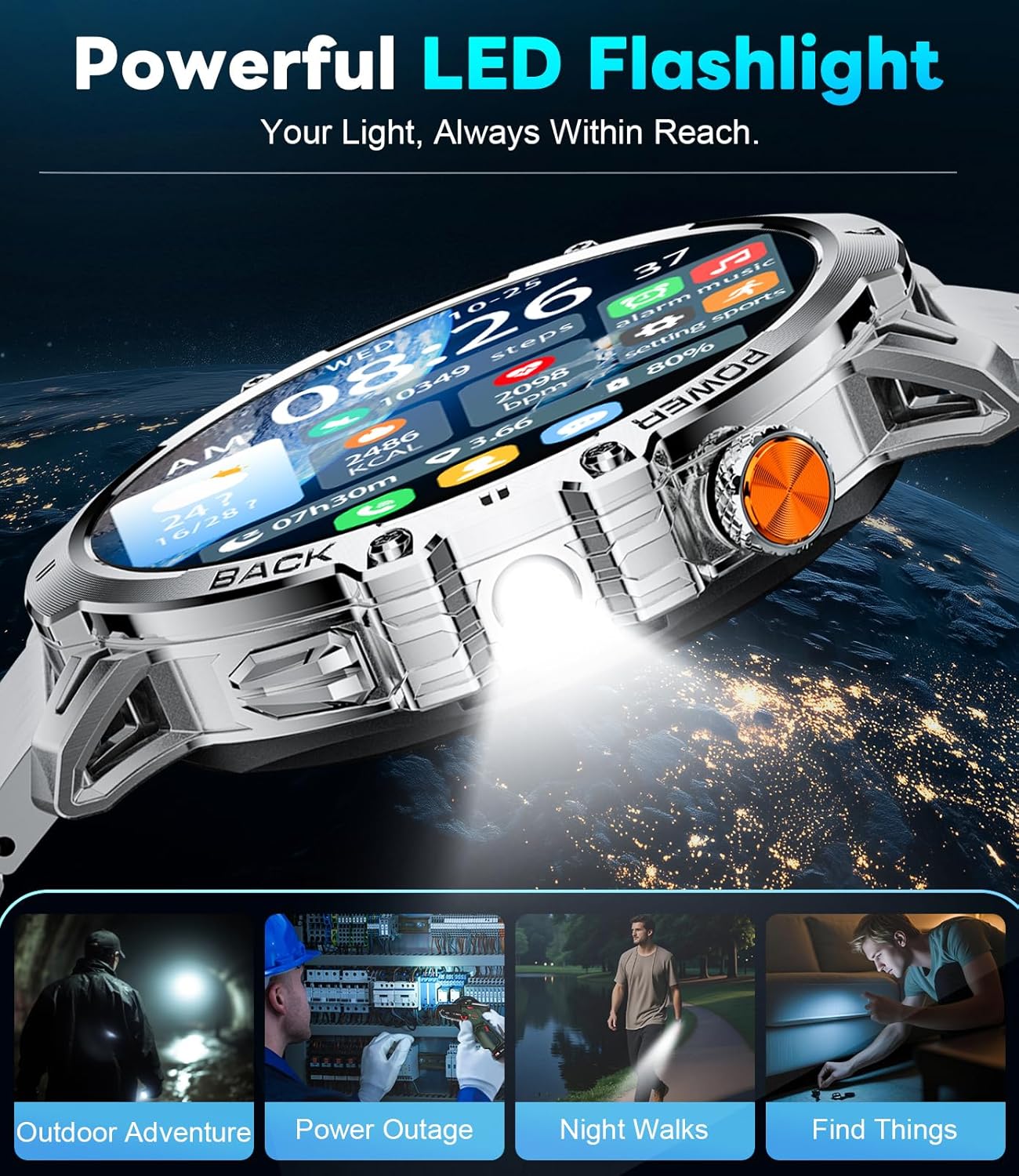 【LED Flashlight, IP68 Waterproof Military-Grade relojes para hombres】 This rugged LIGE 2025 military smart watches for men has undergone a series of rigorous military tests, including extreme temperatures, low pressure, and drilling, offering scratch and shock resistance. The sandblasted metal design and mechanical side buttons blend elegance with functionality. It includes a high-brightness LED flashlight with an illumination range of up to 20 meters. The fully enclosed metal casing and IP68 waterproof rating make it ideal for nighttime and outdoor activities.