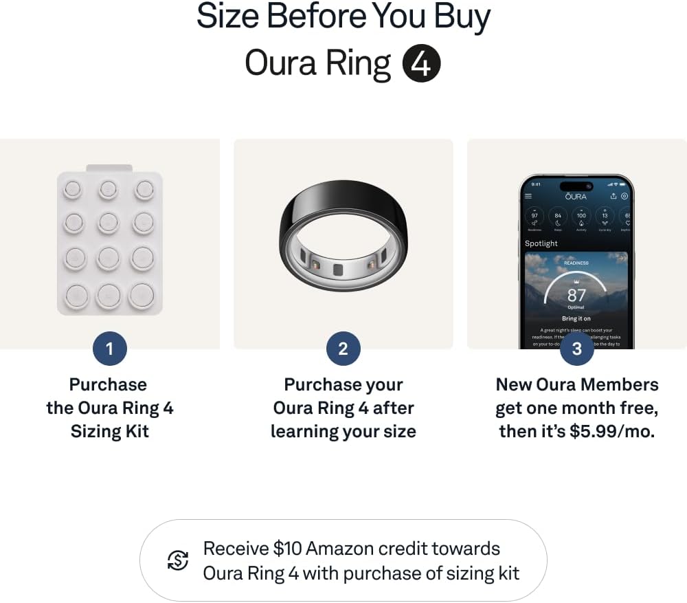 SIZE BEFORE YOU BUY – Oura Ring 4 sizes are different from standard ring sizes. Size yourself with the Oura Ring 4 Sizing Kit. For additional details, see “From the brand” section below