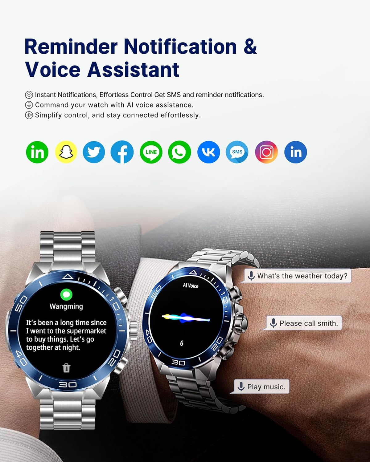 【Bluetooth Calling, Voice Assistant, and Notifications】Equipped with an integrated microphone and high-fidelity speaker, SOUYIE Smart watch for men allows you to make/receive/reject calls, view call logs, and add contacts. Android smart watches for men also receives reminder notifications (including SMS, Facebook, WhatsApp, Twitter, Instagram, Facebook Messenger, and more) Ensuring you never miss crucial alerts.