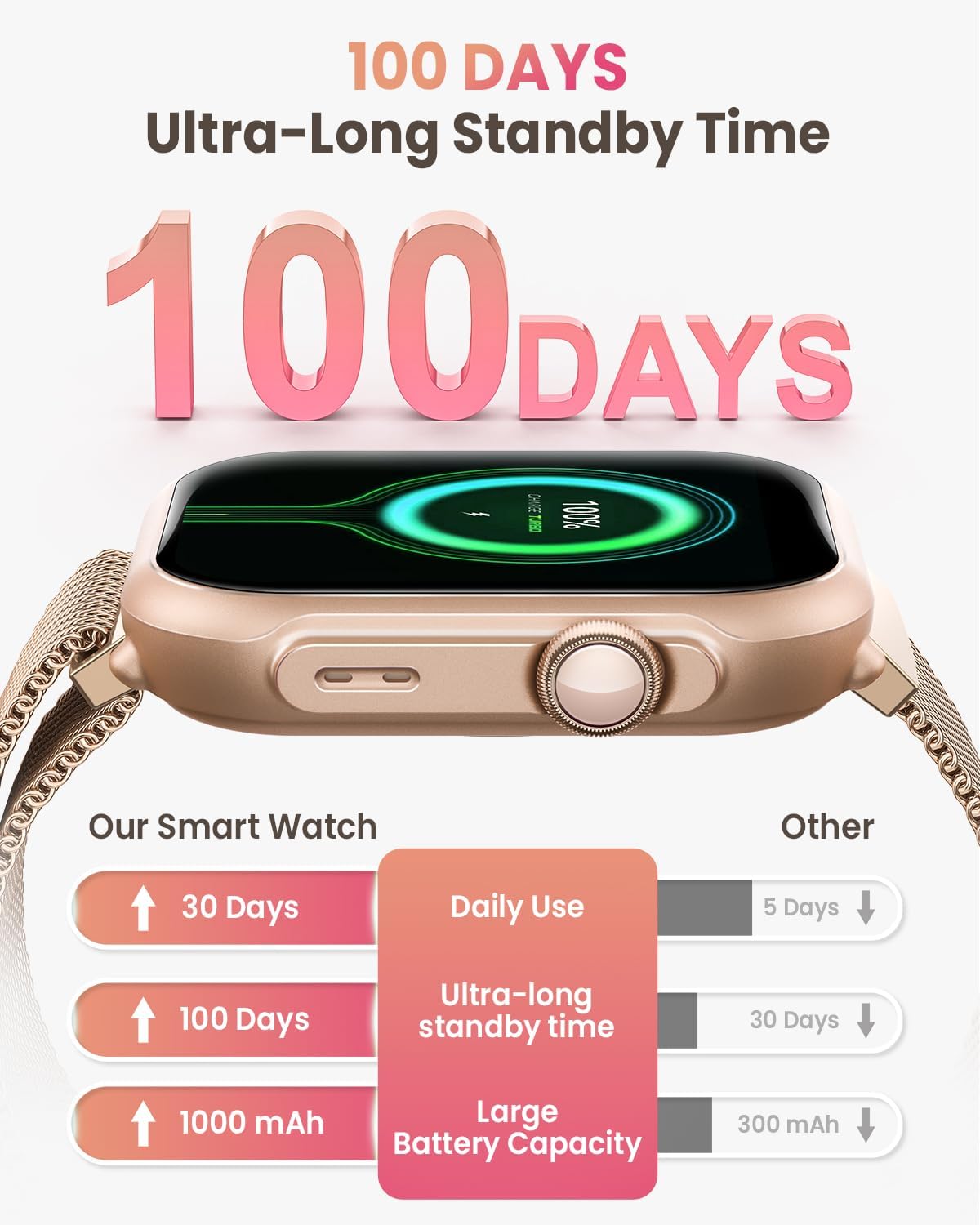 【30+ Days Battery Life – Never Stop Exploring】Say goodbye to daily charging! With a powerful 1000mAh battery, smart watch lasts up to 30 days on a single charge (100 days in standby) and powers up in just 2.5 hours. Perfect for travelers, adventurers, or busy professionals who need reliable all-day tracking without interruptions. Works seamlessly with iOS 9.0+ and Android 6.0+, outperforming other android smart watch and smart watch for android phones in endurance