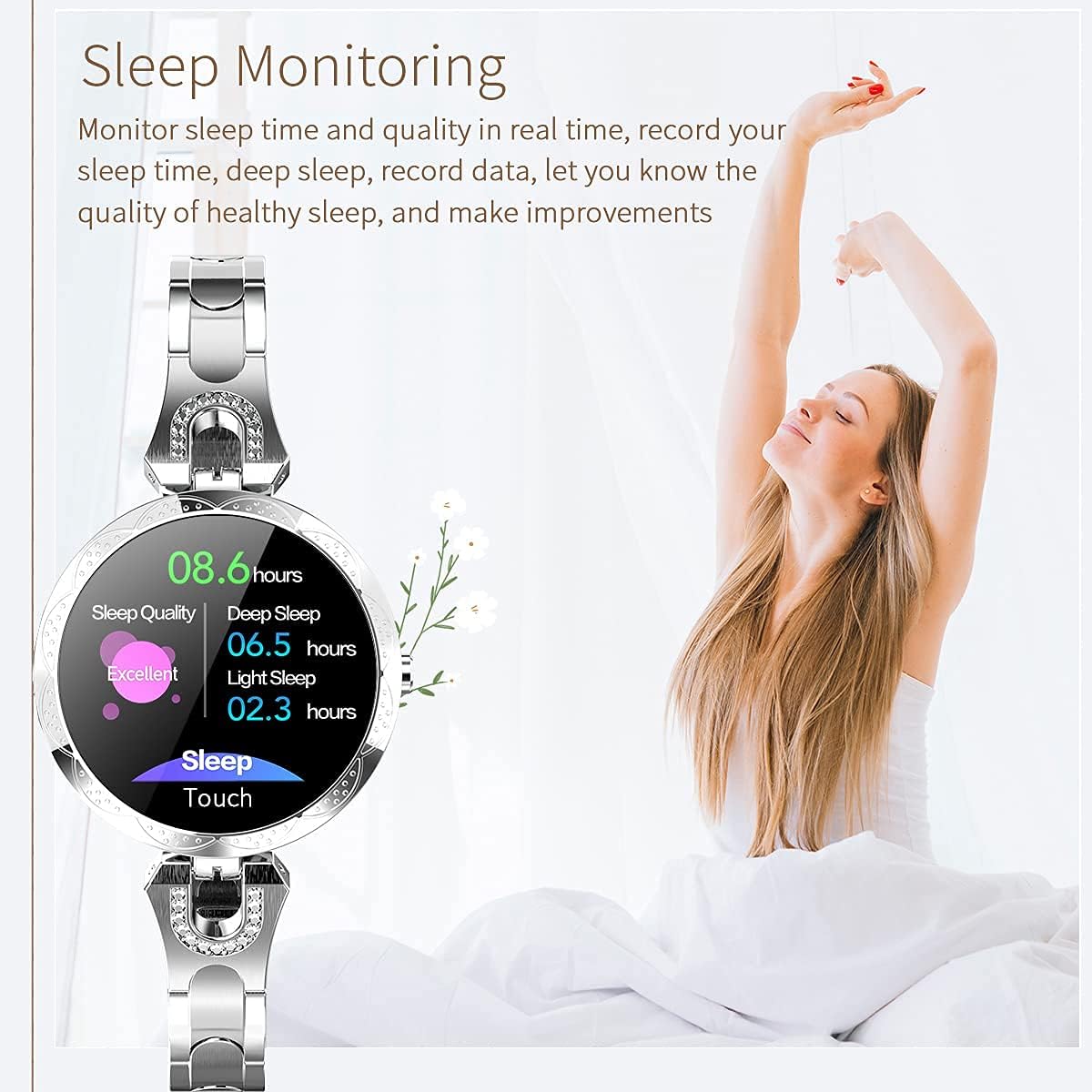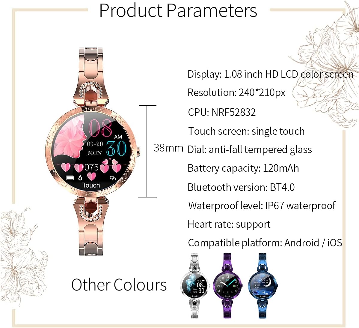 ❤【Tailored for Women】 This ladies smartwatch with spherical tempered glass, exquisite appearance, and 1.08” HD color screen. The women smart watch is designed with female menstrual cycle function, reminds the calculated safe period and fertile period.