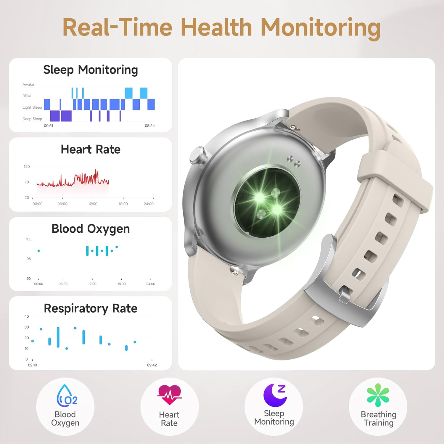 [24/7 Health Monitoring & 100 sports modes] The Smartwatch has 12 built-in regular sports modes, expandable to 100 sports modes, including running, hiking, cycling, yoga, and more, meets the needs of most sports enthusiasts. The fitness trackers will accurately record your calories burned and distance traveled. Synchronize all recorded data to your phone for effective health analysis. It also supports sleep monitoring (deep/light sleep, awakening), providing sleep quality analysis and suggestions.