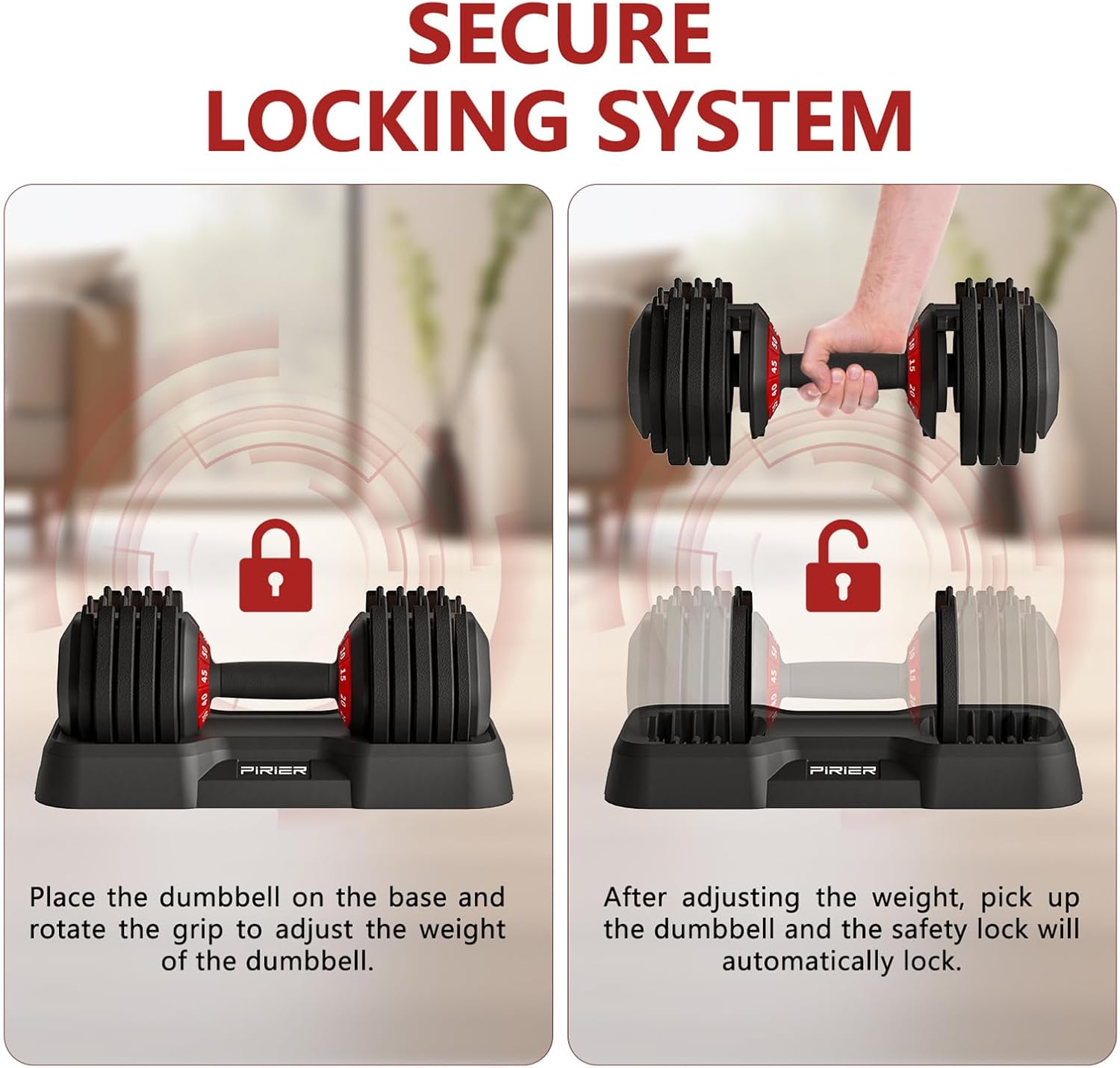 【Secure Dual-Locking System】The PIRIER adjustable dumbbell is equipped with a distinctive dual safety locking mechanism. The dumbbell plates are securely attached to the handle via eight locking slots, providing enhanced safety and stability during use