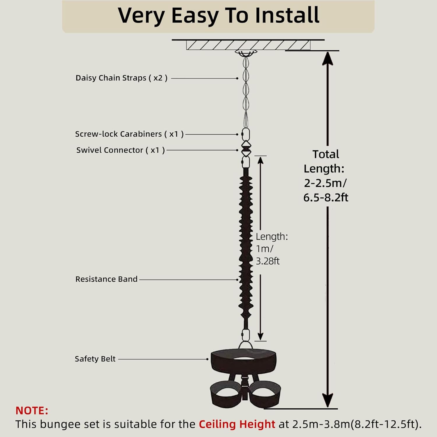【6 Sizes for Choosin】Our elastic rope fitness setup comes in multiple resistance levels, with an adjustable safety harness designed for all body types: XS: 88–110 lbs S: 110–132 lbs M: 132–154 lbs L: 154–176 lbs XL: 176–198 lbs XXL: 198–220 lbs Note: Suitable for ceilings/floors 2.5–3.8m (8.2–12.5 ft) in height