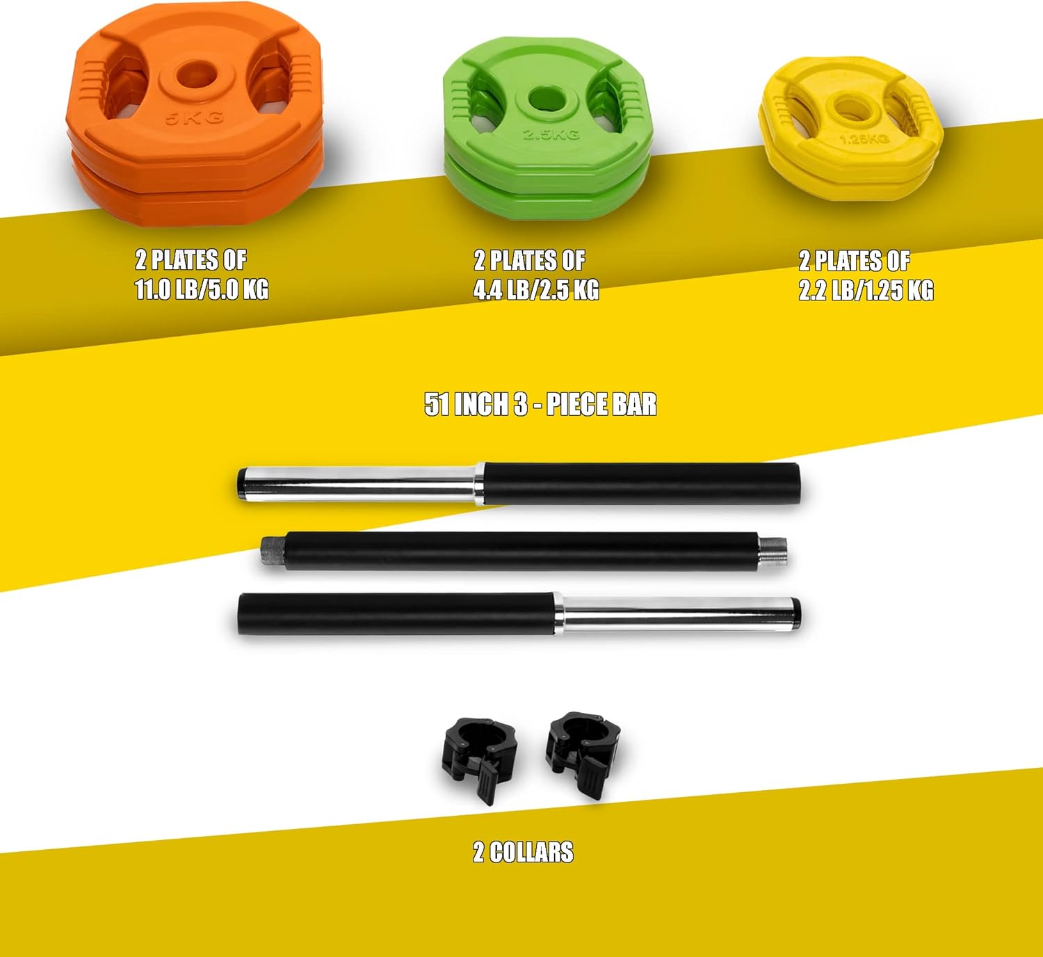 FULL SET EQUIPMENT – This set comes with all the equipment you need to get started: (2) x 5kg, (2) 2.5kg, (2) 1.25kg, (1) x Barbell, (2) x Clamp collars.