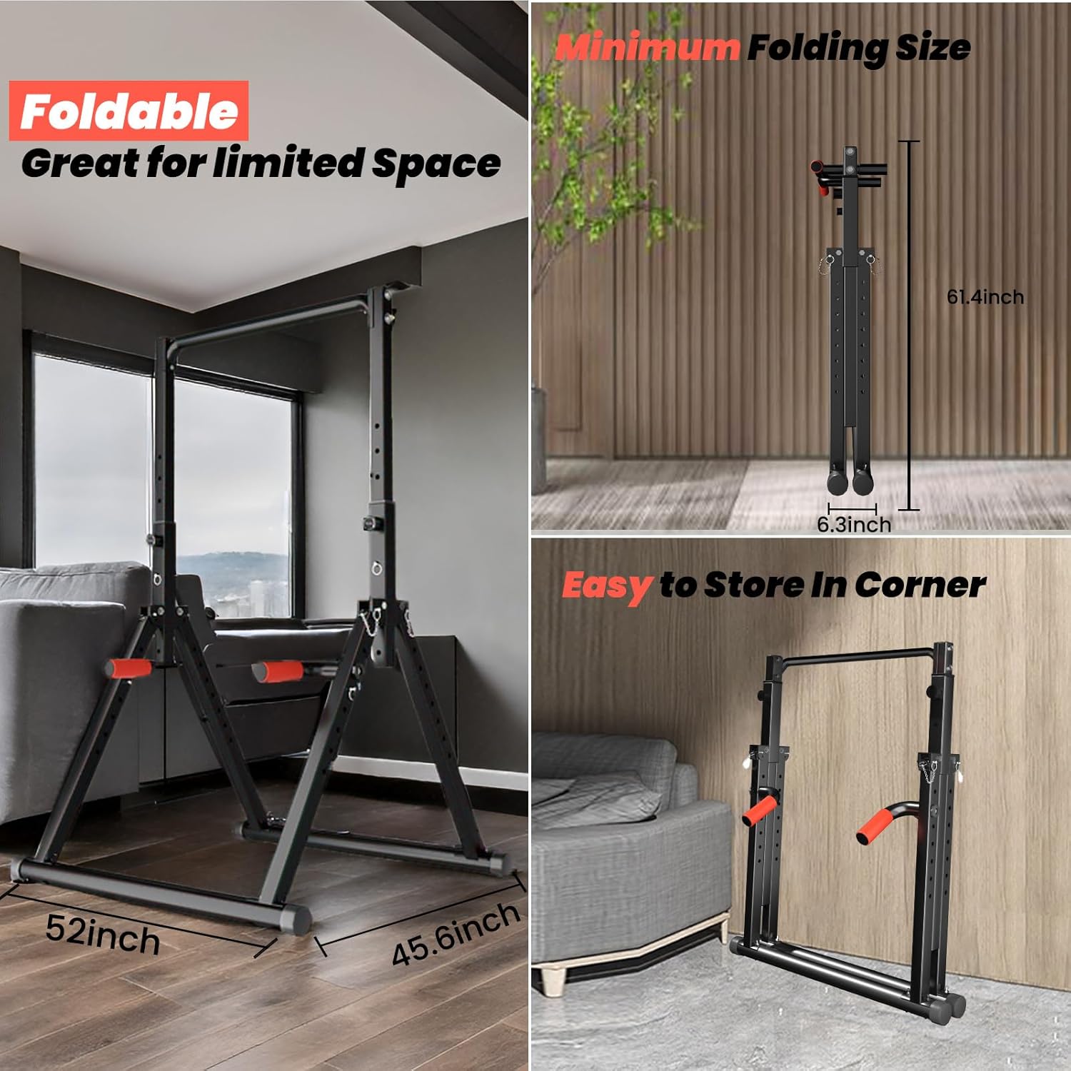 【Foldable Pull Up Bar Station】:This power tower pull up bar has a special folding triangular legs design, which is more stabler than an H-shaped power tower pull up station. You can easily fold up the power tower dip station after the workout, saving space, great for limited space.