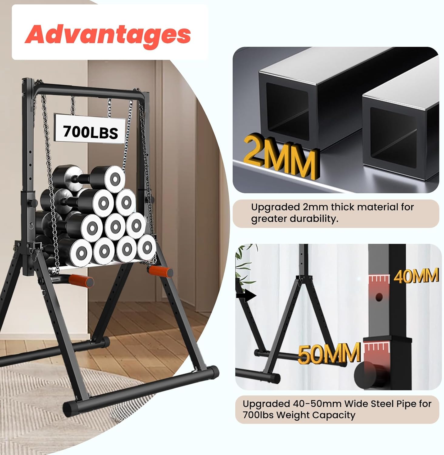 【Thickening Materials, Very Durable to Support 700lbs】: The chin up bar dip station is made up of 2mm thickened material, 40mm-50mm thickening steel pipe, very durable to support weight up tp 770 lbs.