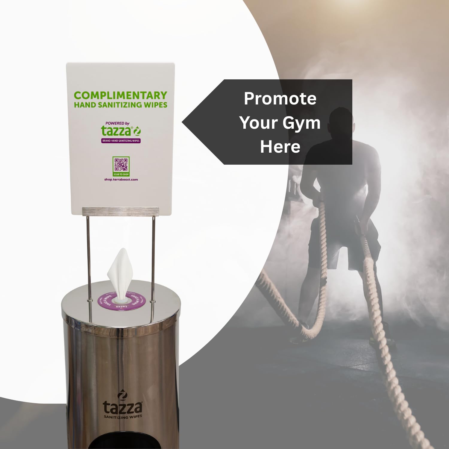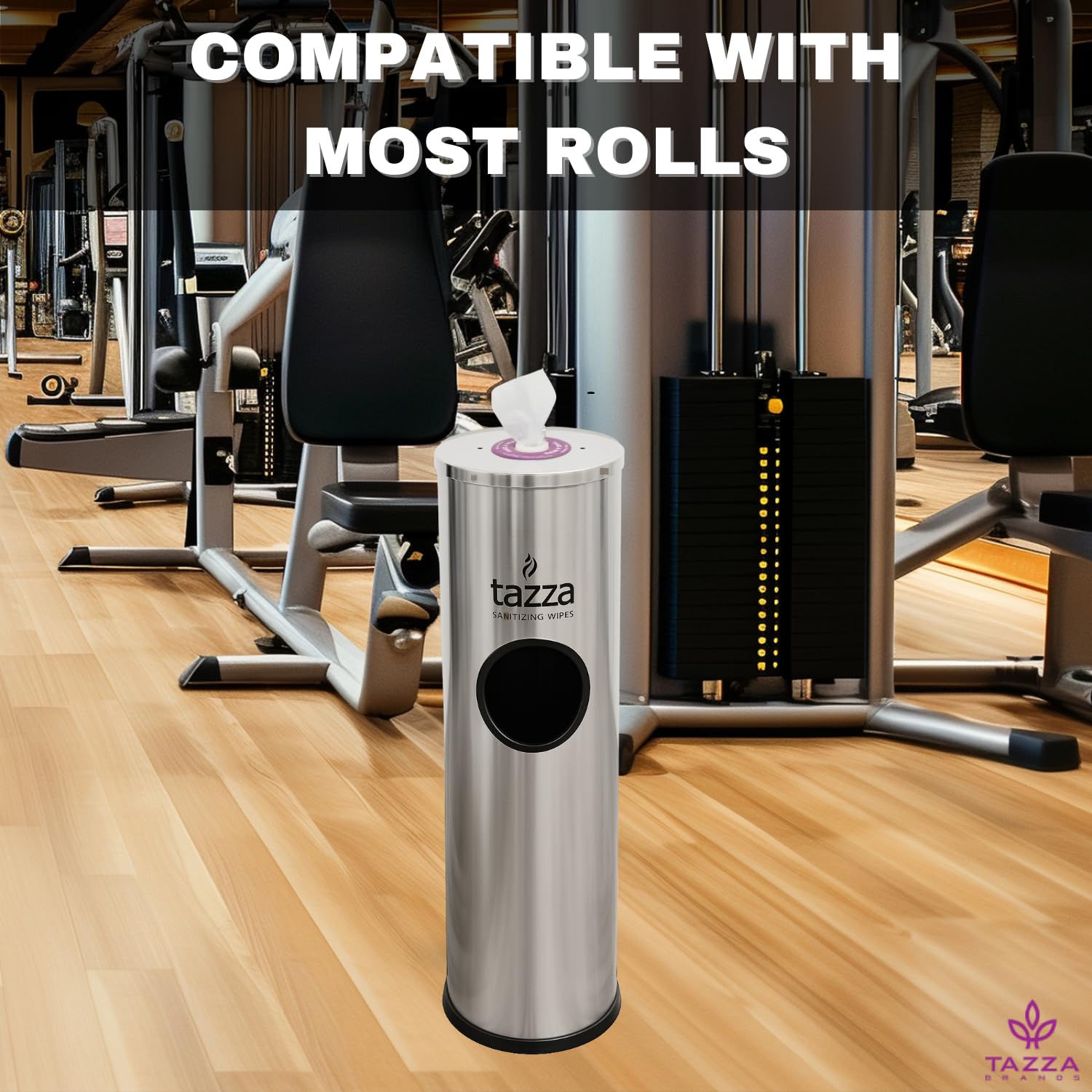 Keep your gym, fitness center, or studio clean and organized with the Tazza Stainless Steel Wipe Dispenser and integrated trash can, designed for high-traffic environments. This all-in-one unit combines a disinfecting wipes dispenser and a 1.5-gallon gym garbage can, making it easy to dispose of used exercise equipment wipes and maintain a hygienic space. The compact 9.9 x 9.9-inch footprint and 36-inch height fit seamlessly in any workout area, while the sleek stainless steel finish adds a modern, decorative touch to commercial gym equipment or even a home gym. The precision nozzle ensures smooth, tangle-free dispensing of gym wipes, fitness wipes, or wet wipe refills, preventing snags and keeping workouts uninterrupted. The easy-lift lid and accessible door allow for quick reloads and hassle-free maintenance, compatible with all Tazza gym wipes refills and most standard workout wipes equipment. Durable, heavy-duty construction stands up to daily use, making this dispenser ideal for busy gyms, yoga studios, or commercial bathroom trash can needs. Perfect for indoor use, this versatile wipe dispenser is also suitable as a baby wipe dispenser or for use in a wipe dispenser bathroom, offering a space-saving hygiene solution that supports a clean, welcoming environment for members and guests.