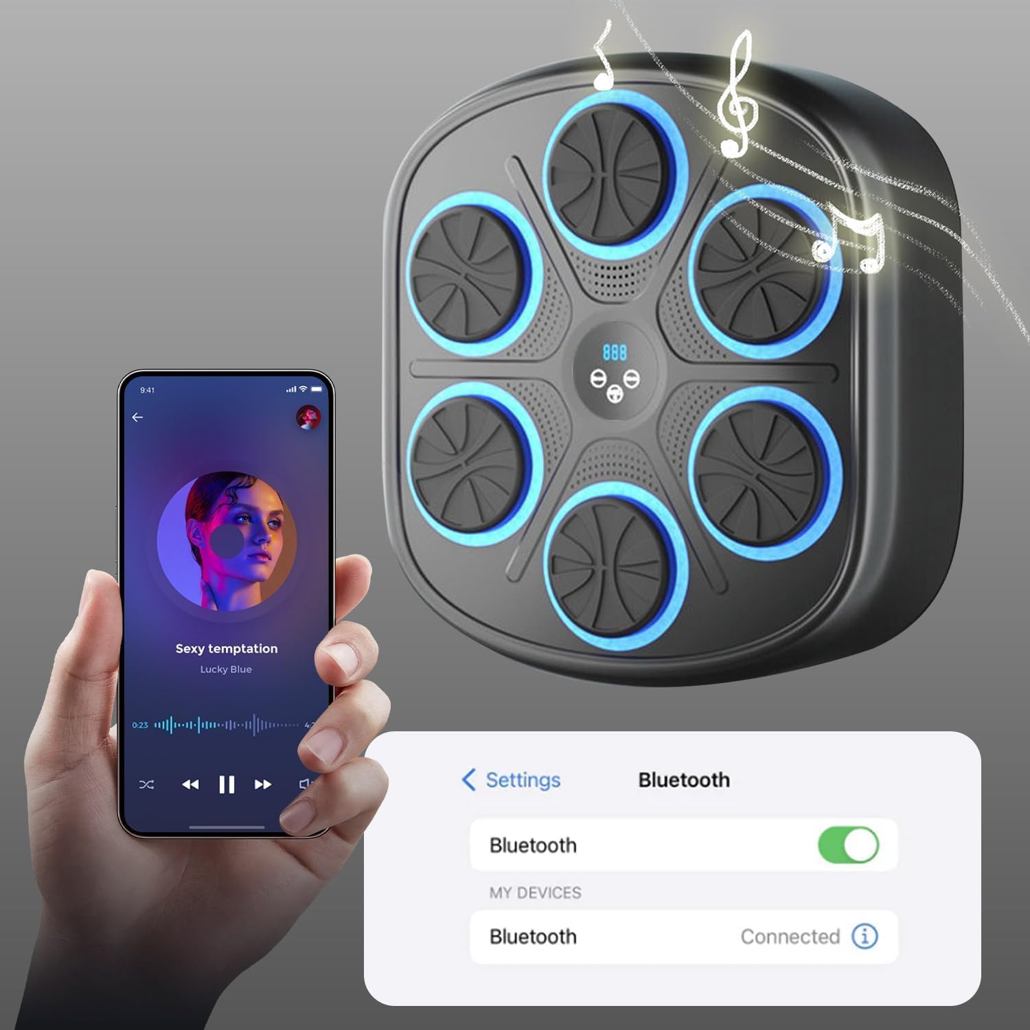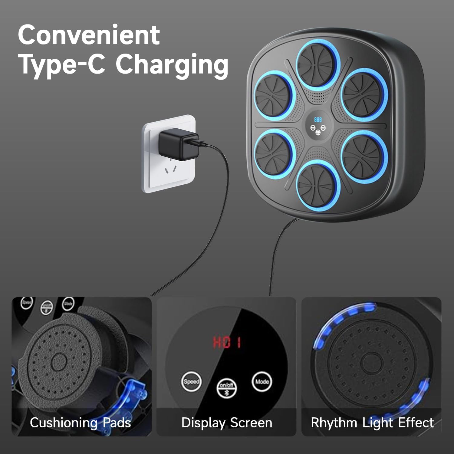 More Convenient Designs: This boxing music machine with gloves supports wireless use and can be charged via USB cable. The multi-layer cushioning ensures a comfortable striking feel while reducing noise. The upgraded six-targets enhances training efficiency, and the large 16.46″*17.56″*2.95″ design improves the overall exercise experience. The Bluetooth speaker, paired with the dynamic LED light strip on the panel, enhances your enjoyment of the workout.