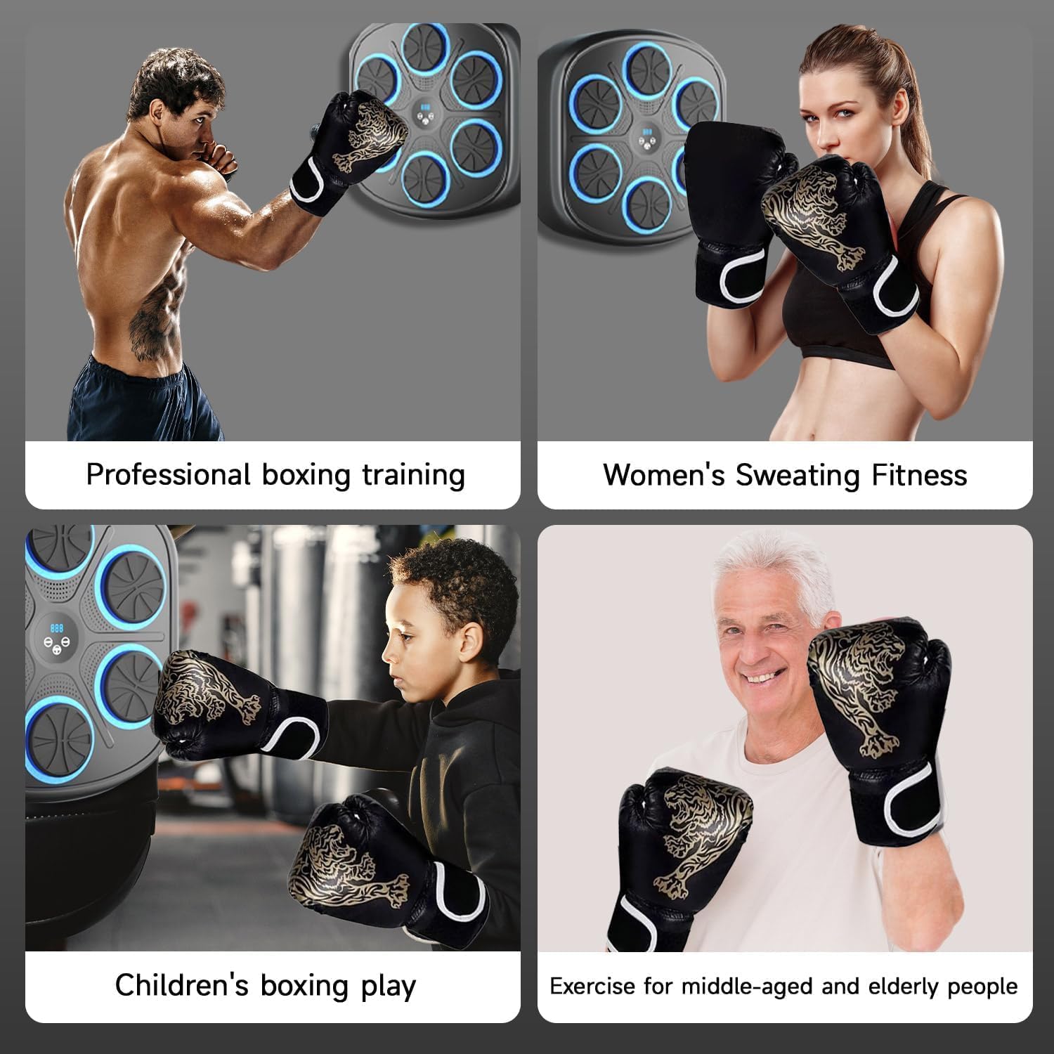Matching Gloves:The smart music boxing machine for adults comes with one pairs of gloves to protect your hands. Package includes: 1*Music Boxing Machine, 1* Boxing Gloves,1* Type-c Cable, 2* Velcro Tape, 1* User Manual.
