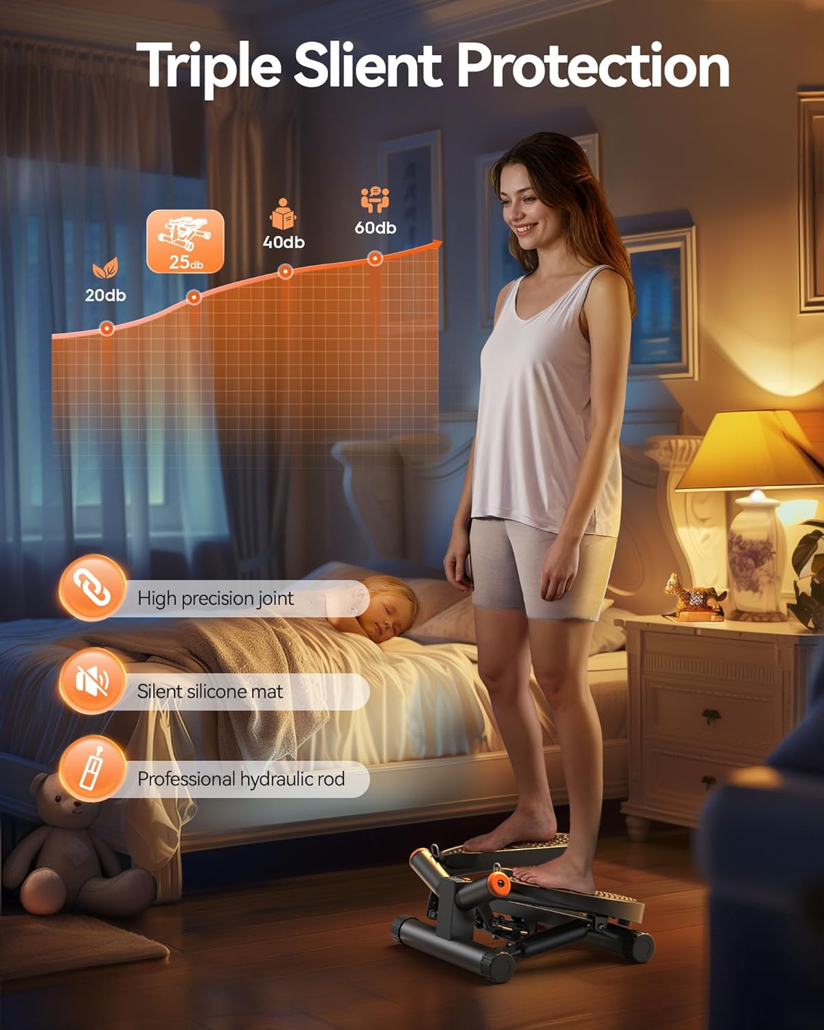Triple Slient Protection: Niceday stair stepper has a professional hydraulic rod and high-precision movement joints, while there is a silicone pad below, there will be a buffer when stepping, the movement sound is only 25 decibels, so don’t worry about waking up the child sleeping at home