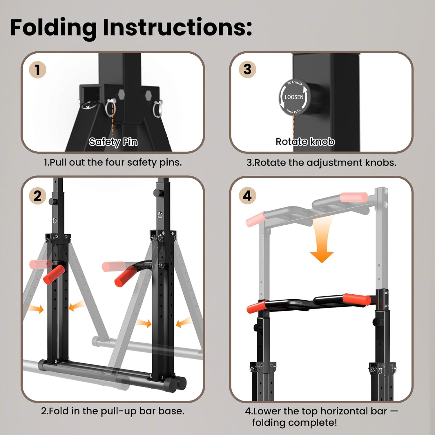 FOLDABLE PULL UP BAR: Considering the space issue in indoor fitness, our pull up dip station are also easy to store. The pull up tower can be folded in a compact size of 39.4″(L)×6.3″(W)×61.4″(H). After folding, it can be easily placed behind the door or under the bed, greatly improving space utilization. Making it a practical addition to any home gym, garage, or workout area.