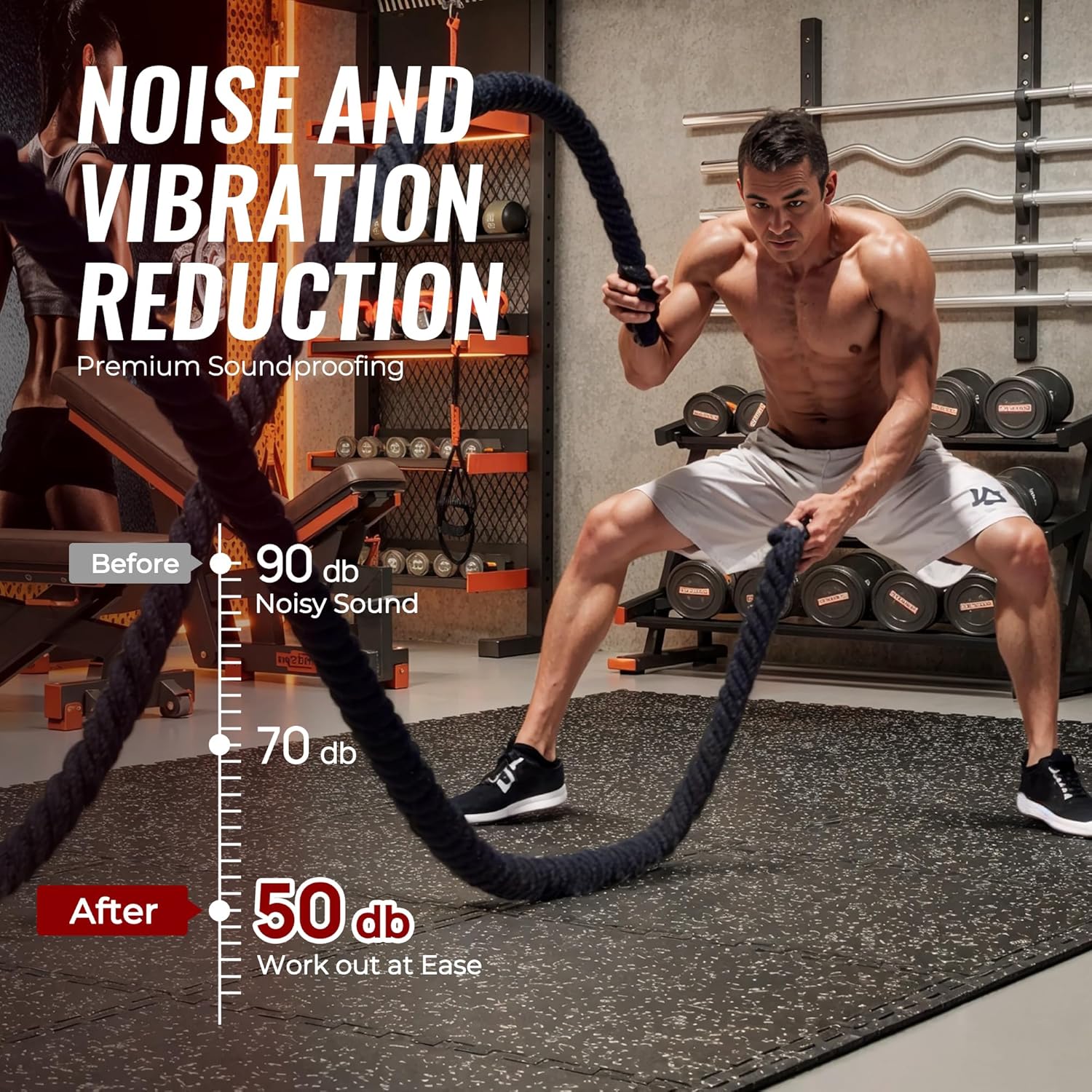 【Upgraded Dual-Layer Design.】A high-density EVA foam base combined with a sturdy EPDM rubber top. This construction can bear heavy exercise equipment, ensuring it won’t tear easily due to weight or vigorous movements, guaranteeing long-lasting resistance to wear and tear.
