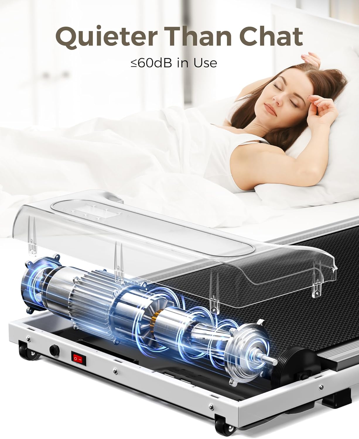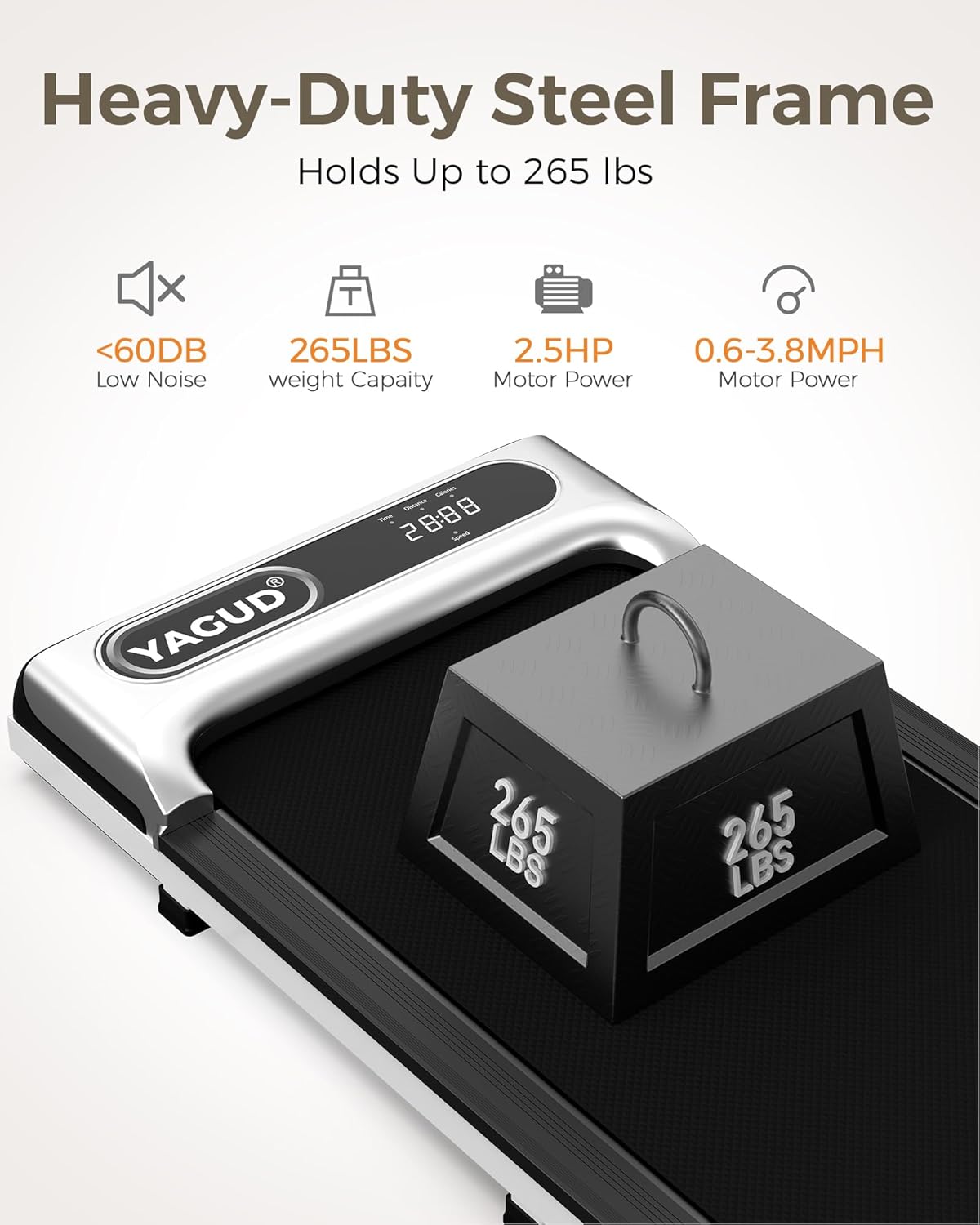 2.5HP Powerful Motor: The treadmill is equipped with a powerful 2.5HP motor and offers a large weight capacity of up to 265 lbs. And it is quiet while using. Using noise below 45 DB, so you can exercise while not disturbing others.