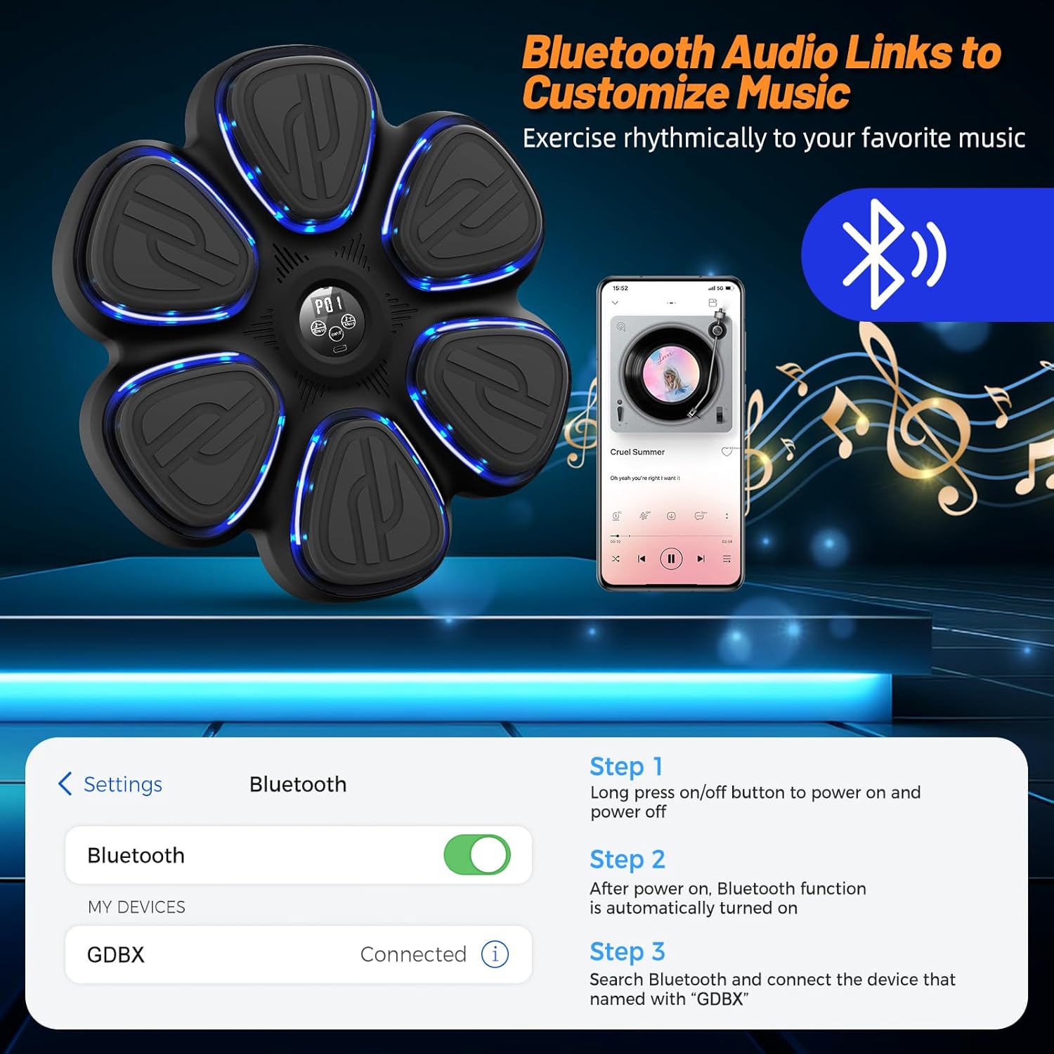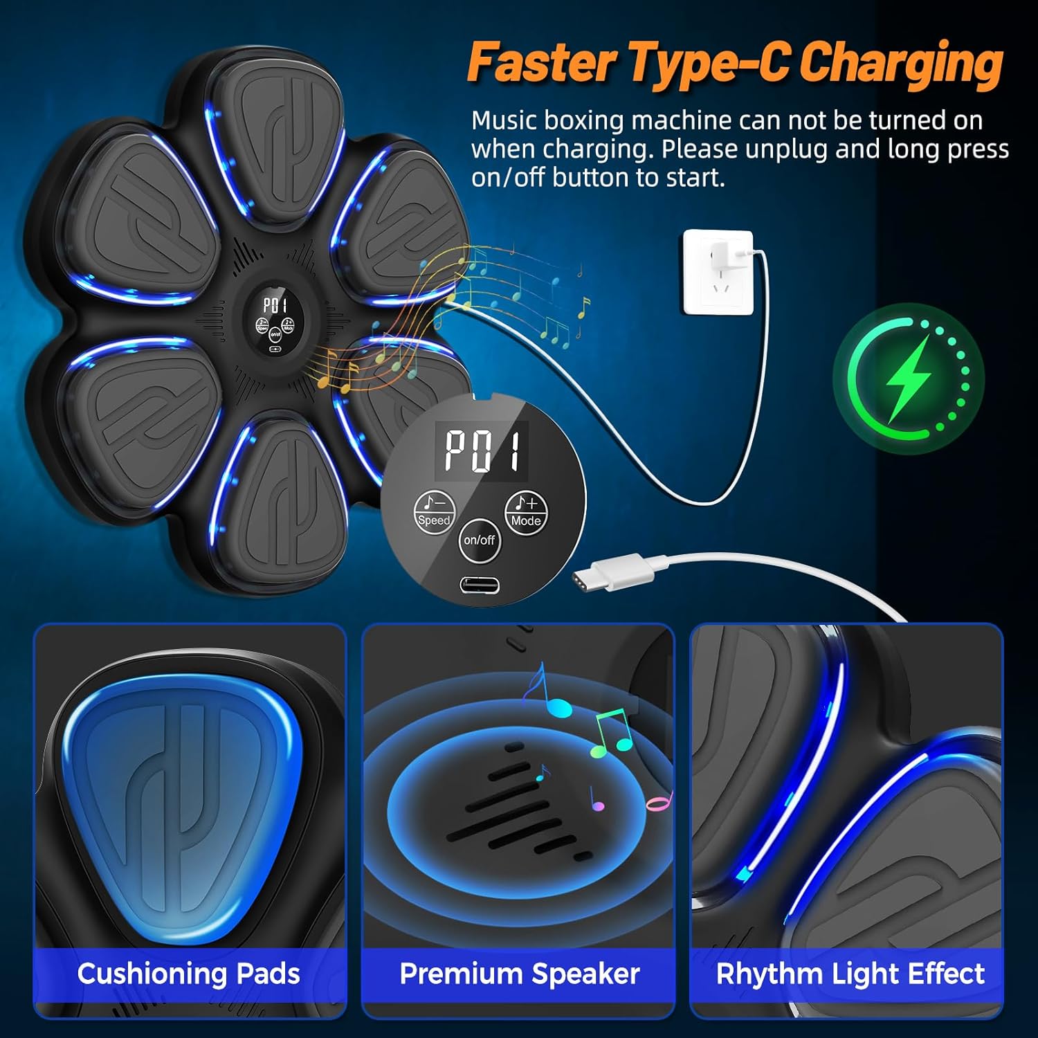 Bigger boxing panel, fast and stable Bluetooth, 9 modes and speed adjustable, smart LED embedded with upgraded chip.