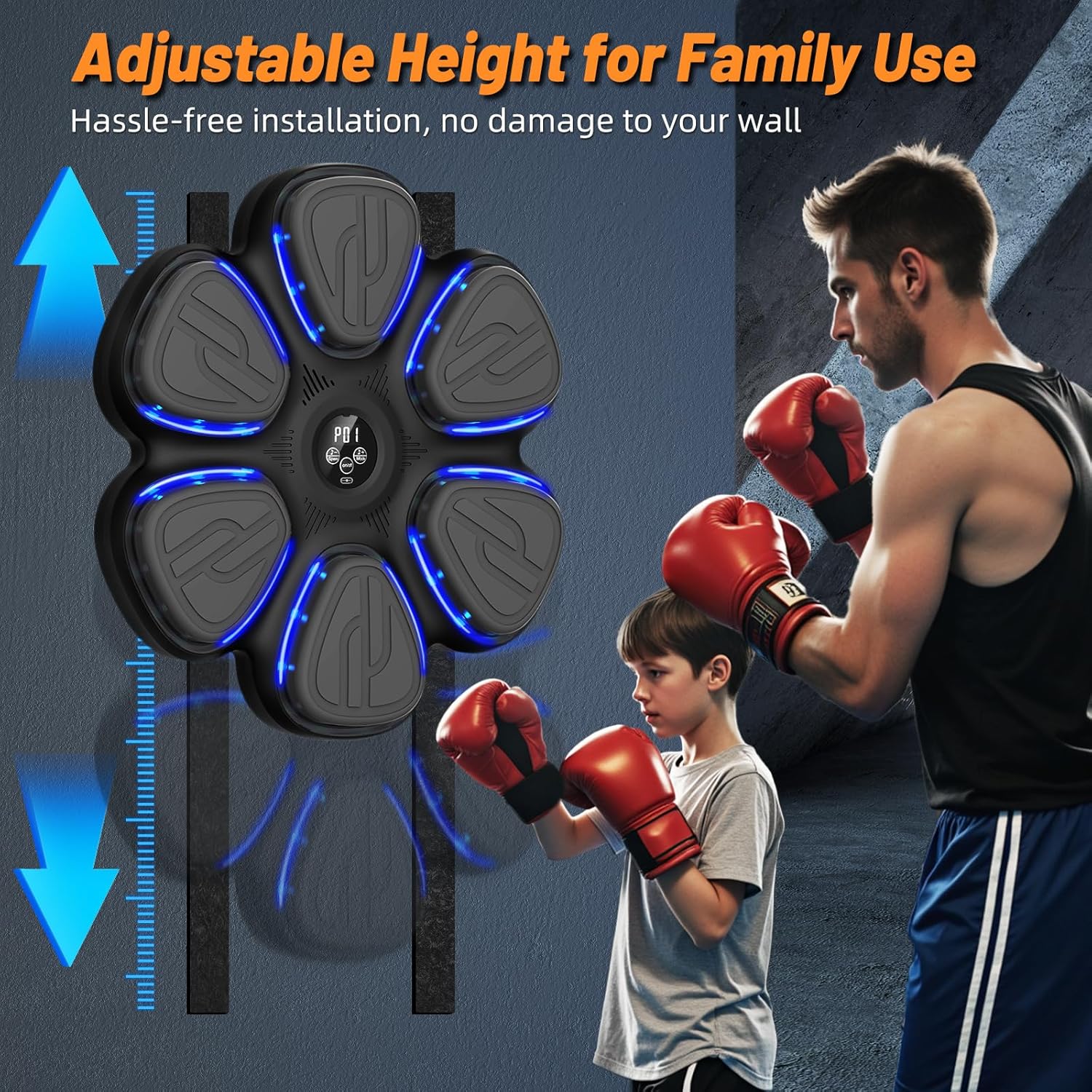 WALL MOUNTED EASY INSTALLATION – This music boxing training machine is designed to be wall-mounted, requiring no drilling for installation, saving space while being securely fixed to the wall with Velcro straps, ensuring stability and safety during use. Users can also freely adjust the height according to their needs, accommodating users of different heights.