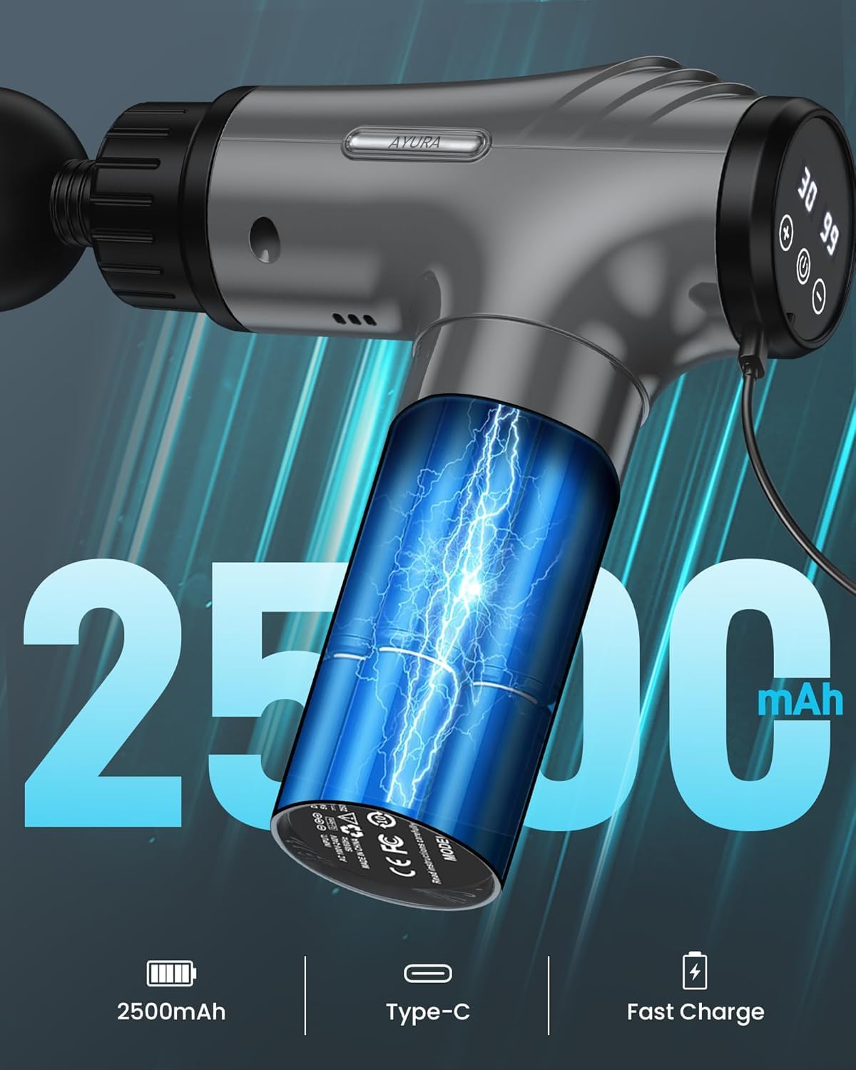 ALL-DAY COMFORT, WHEREVER YOU GO: The percussion massage gun with 2500mAh long-life battery and fast USB-C charging to keep your massage sessions uninterrupted—electric massage gun for home, gym or travel; Spend less time waiting and more time rejuvenating