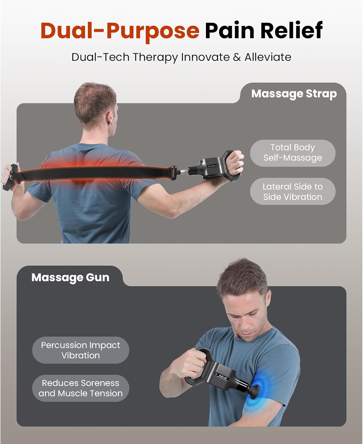 Dual-Mode Powerful Therapy (Deep Precision + Large-Area Relief): Innovatively combines “massage gun” and “massage strap” dual modes: The massage gun (vertical percussion) penetrates deeply to target muscle knots, quickly dissolving lactic acid; the massage strap (lateral vibration) gently kneads large areas to boost circulation and soothe tight muscles. Effectively relief post-workout soreness in thighs and calves, stiff shoulders/neck/back from desk work, or fatigued arms from housework.