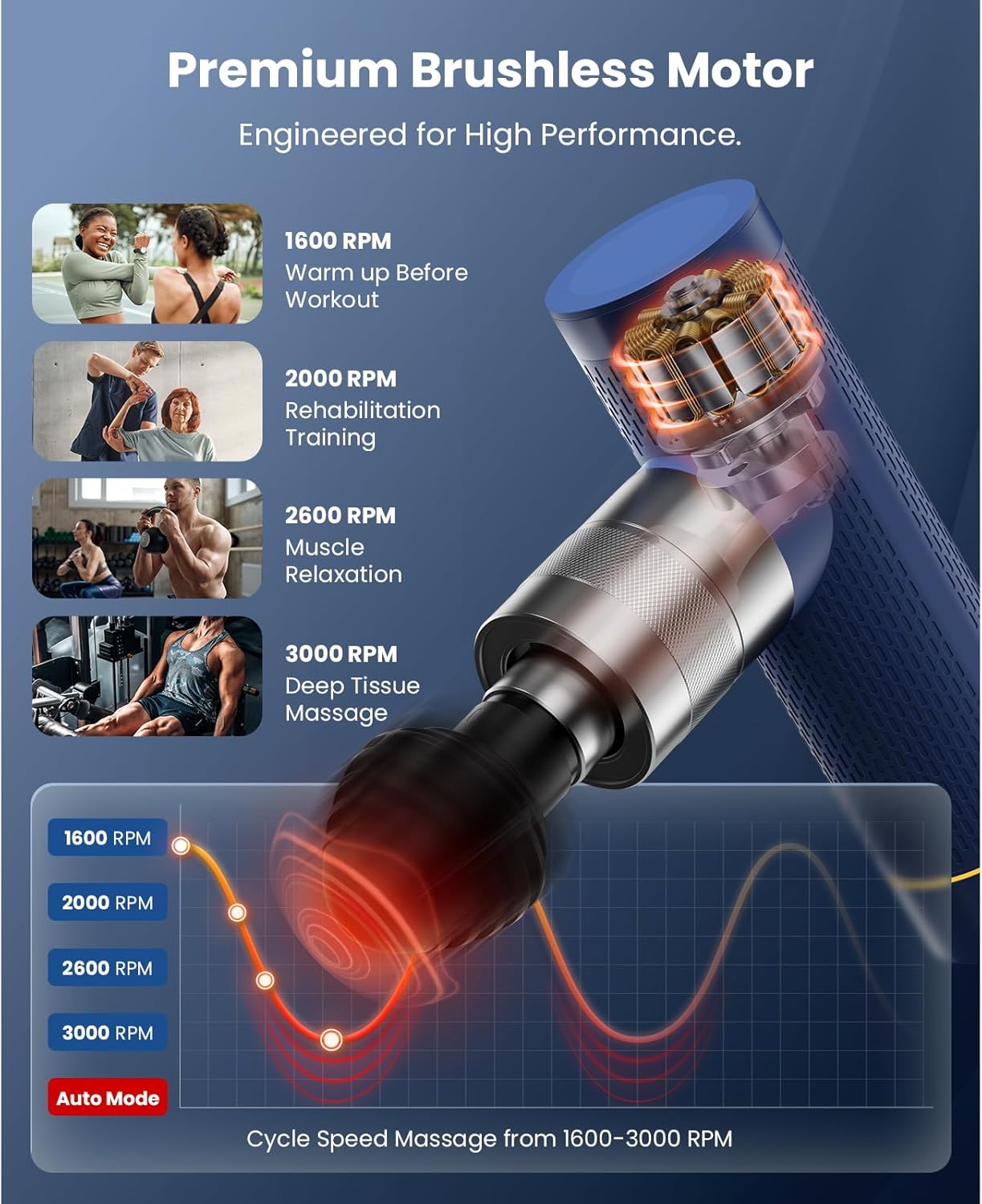 Illuminate Your Recovery with Style: Featuring a captivating LED light system, the muscle gun gives you complete control over your recovery routine by displaying precise pressure feedback. It offers 5 adjustable speeds ranging from 1600 to 3000 RPM, enabling you to fully experience the advantages of massage therapy for muscle recovery, improved performance, stress relief, restful sleep, and more. It also features an auto speed that cycles from 1600-3000 RPM