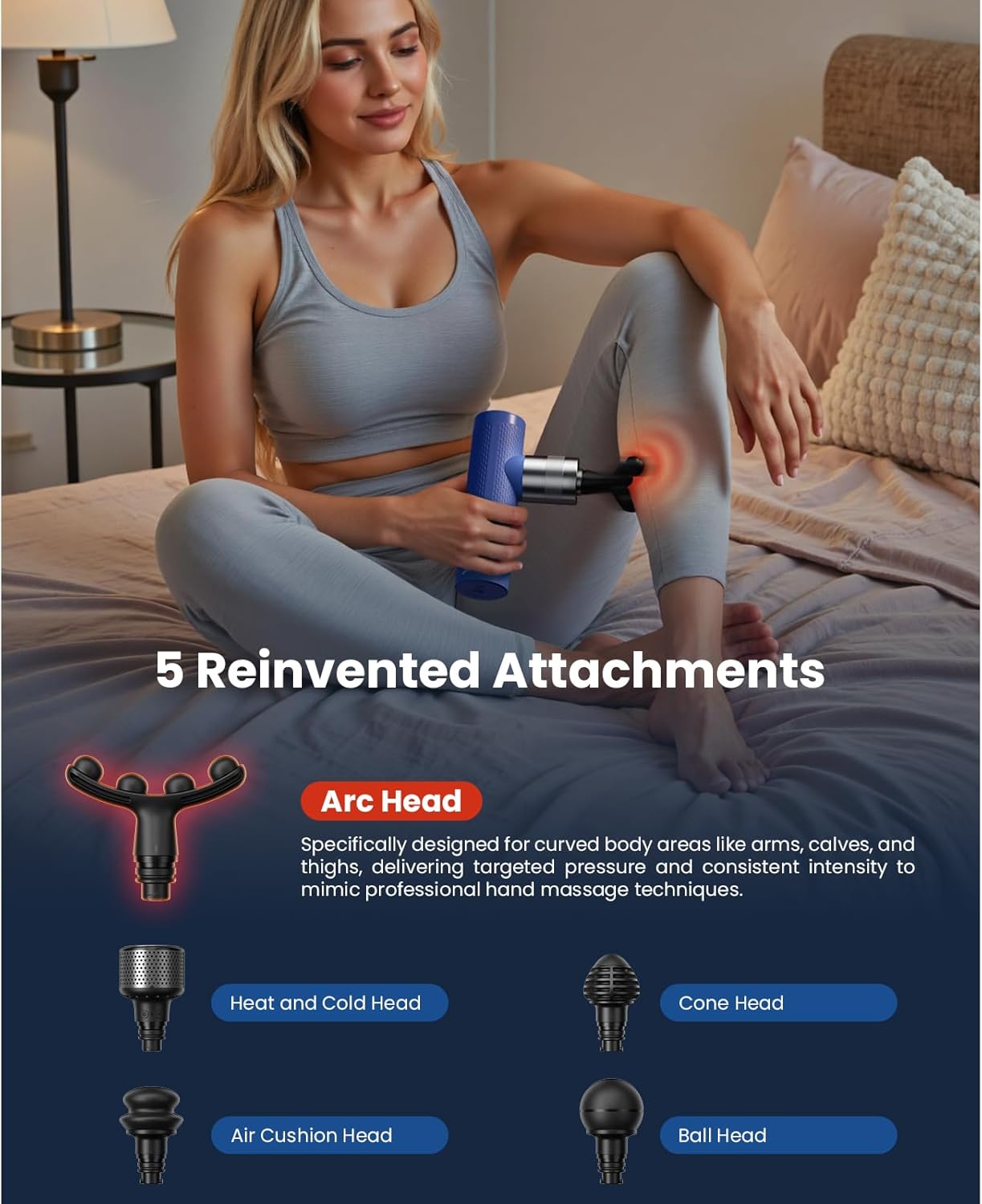 5 Versatile Massage Heads: Personalize your massage experience with 5 uniquely designed heads tailored for different muscle groups. Each head serves a specific purpose—from targeting knots to soothing larger muscle areas. Use the specialized arc head for curved body areas like arms, calves, and thighs, delivering targeted pressure and consistent intensity to mimic professional hand massage techniques