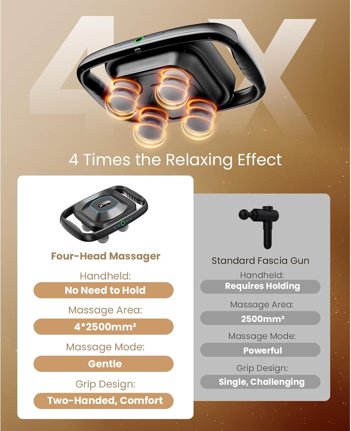 4 Times Massage Effect: Experience an unprecedented fourfold massage effect! With its four massage heads, this deep tissue massage gun is 4 times the massage area of a single massage gun, achieving muscle relaxation in the shortest time possible. It ensures that every inch of your skin can be deeply relaxed. This TheraPanel 4-head massage gun is ideal for unwinding after work or recovering after exercise!