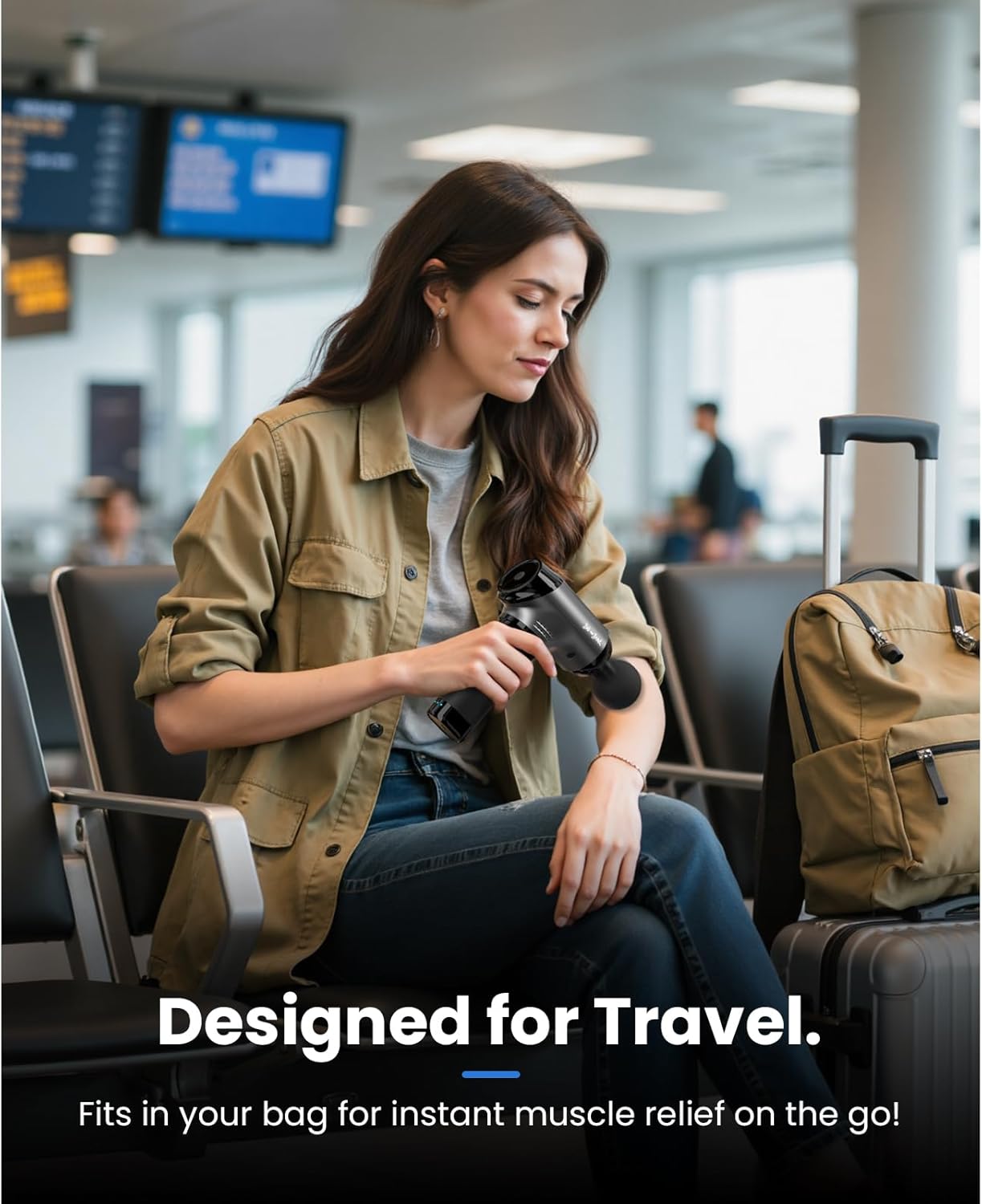 Quiet and Portable Massage Gun: Designed for on-the-go relief (Weighing just 1.9 lbs), this compact massage gun fits effortlessly in your gym bag, backpack, or suitcase. Its ultra-quiet operation (<45dB) makes it perfect for office use, travel, or home without disturbing others. Lightweight yet powerful, it delivers instant relief anytime at home or away. The essential companion for myofascial release and everyday aches and pains.