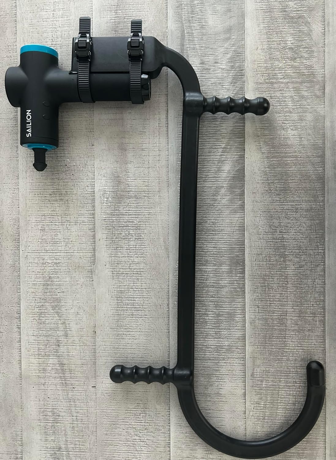 Superior to other massage gun holders due to weight of gun being spread over two points of contact and being able to reach more places with ease.