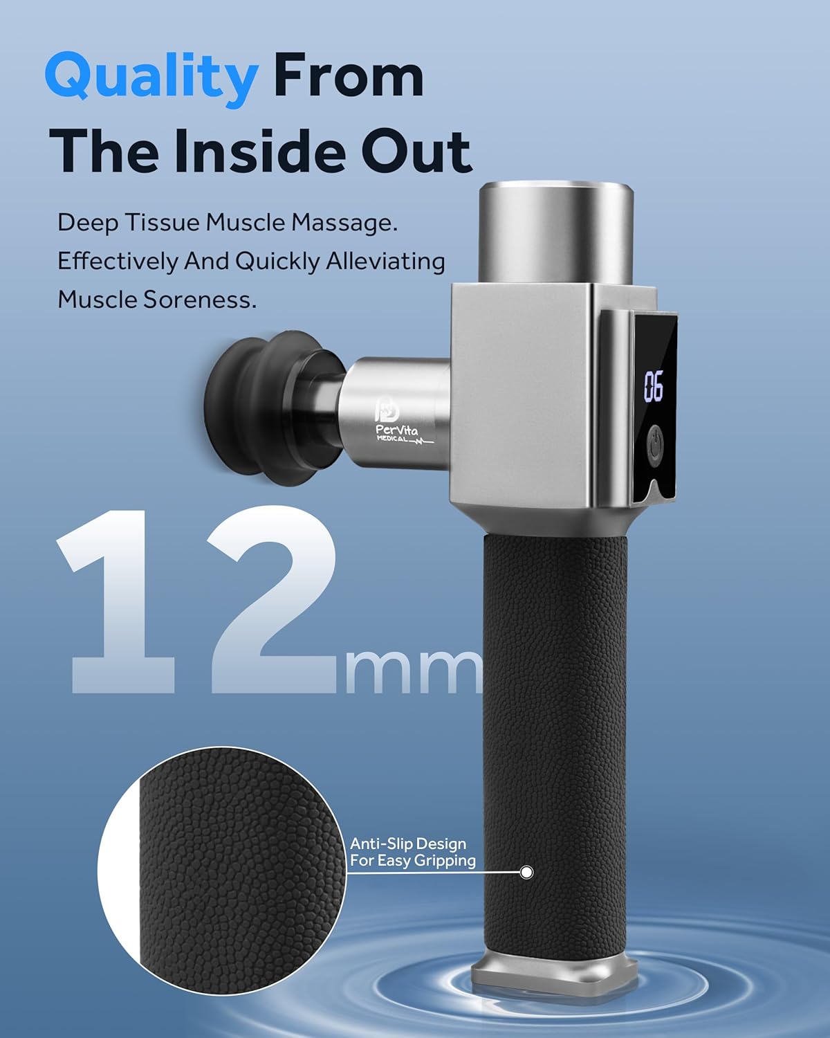 Equipped with a cutting-edge high-speed brushless motor, our massage gun offers a potent 60W of power and an impressive 12mm amplitude for deep-tissue relief. Crafted with precision, our massage gun features an ergonomic design with a non-slip handle for easy and comfortable gripping.