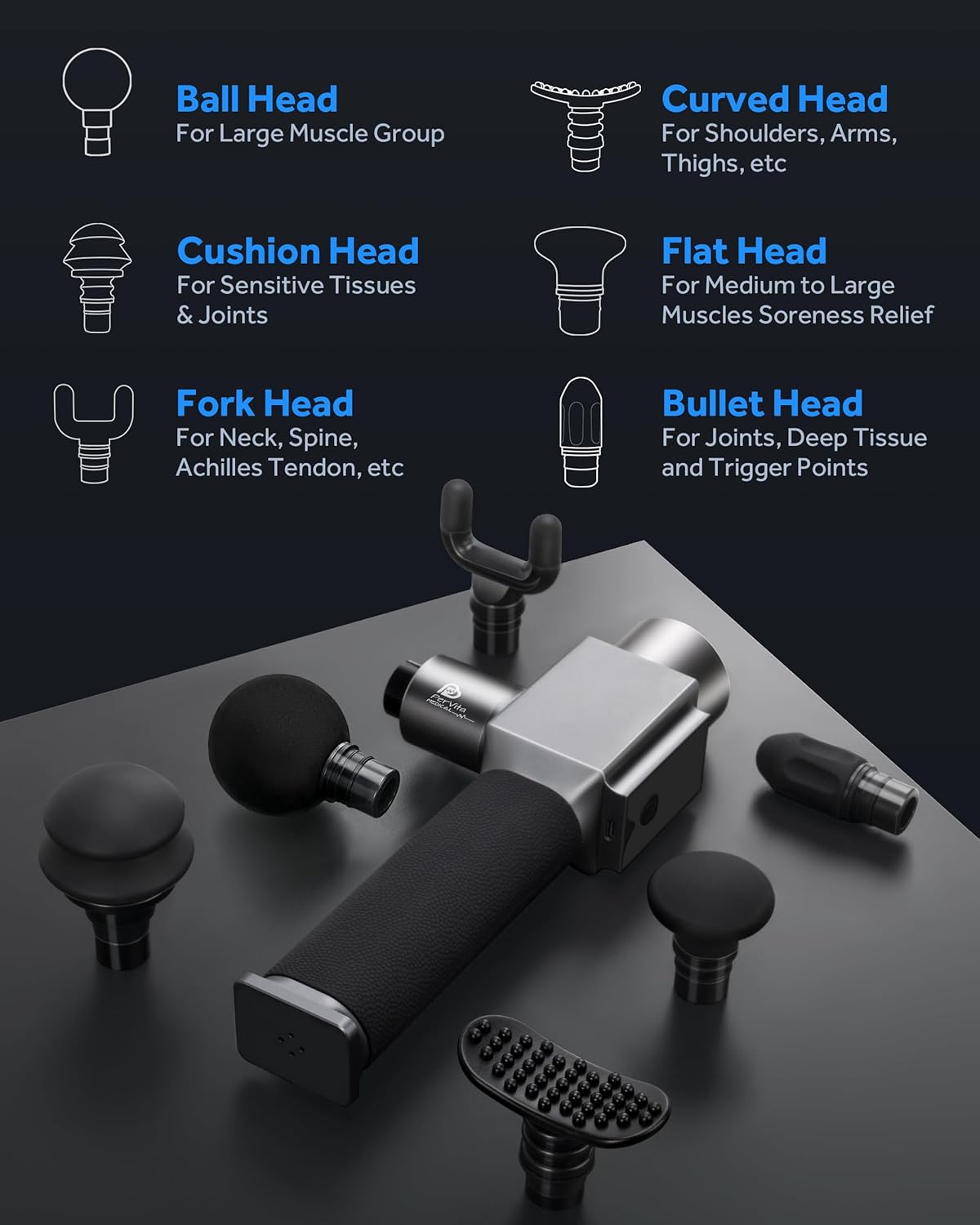 Delve into a customized massage experience with our set of six interchangeable heads: Curved Head, Ball Head, Bullet Head, Flat Head, Cushion Head, and Fork Head. Each head is designed for specific muscle areas, allowing deep-tissue massage and effective relief from muscle and tissue soreness.