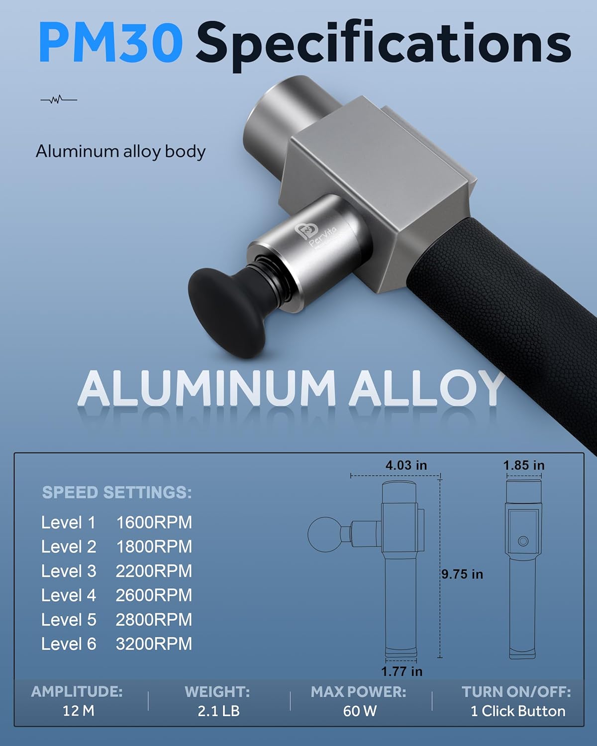 Deep Tissue Massage: With an impressive 12mm amplitude and 6 interchangeable massage heads designed for targeting specific body areas, this massage gun allows for deep and effective muscle and tissue massage, effectively relieving muscle soreness and addressing chronic muscle pain.