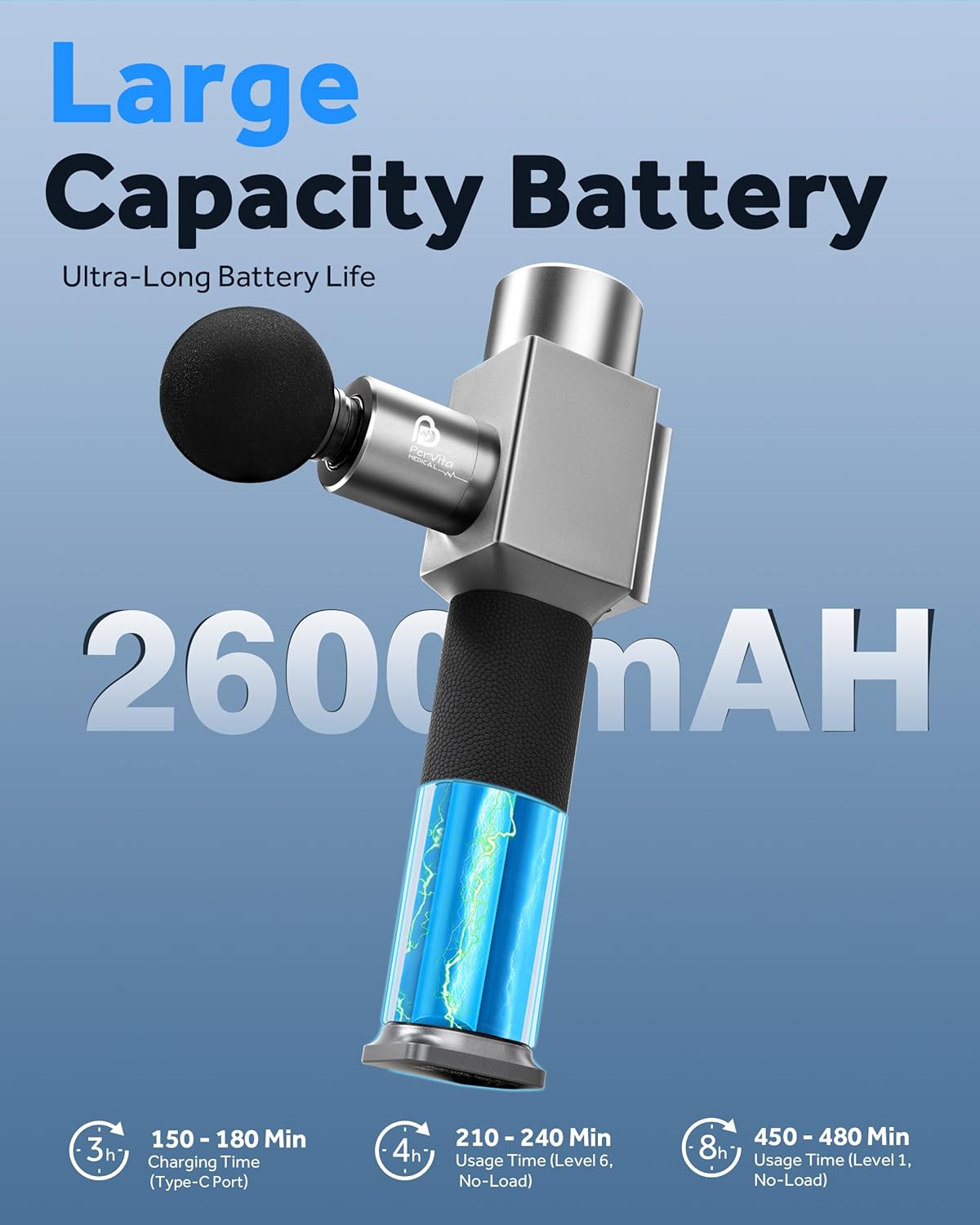 Long-lasting Battery: Equipped with a Type C interface and a high-capacity 2600mAh battery, the massage gun charges fully in just 3 hours and provides up to 8 hours of continuous use. The superior battery quality ensures a reliable and uninterrupted power supply.