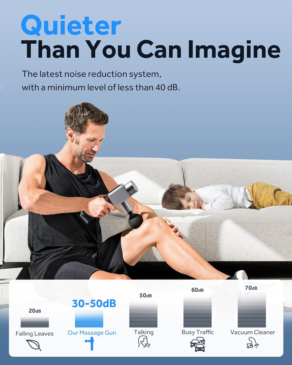 Noise Reduction Technology: Incorporating a proprietary noise reduction system, this massage gun operates at noise levels below 50dB, ensuring a peaceful and comfortable experience during use.