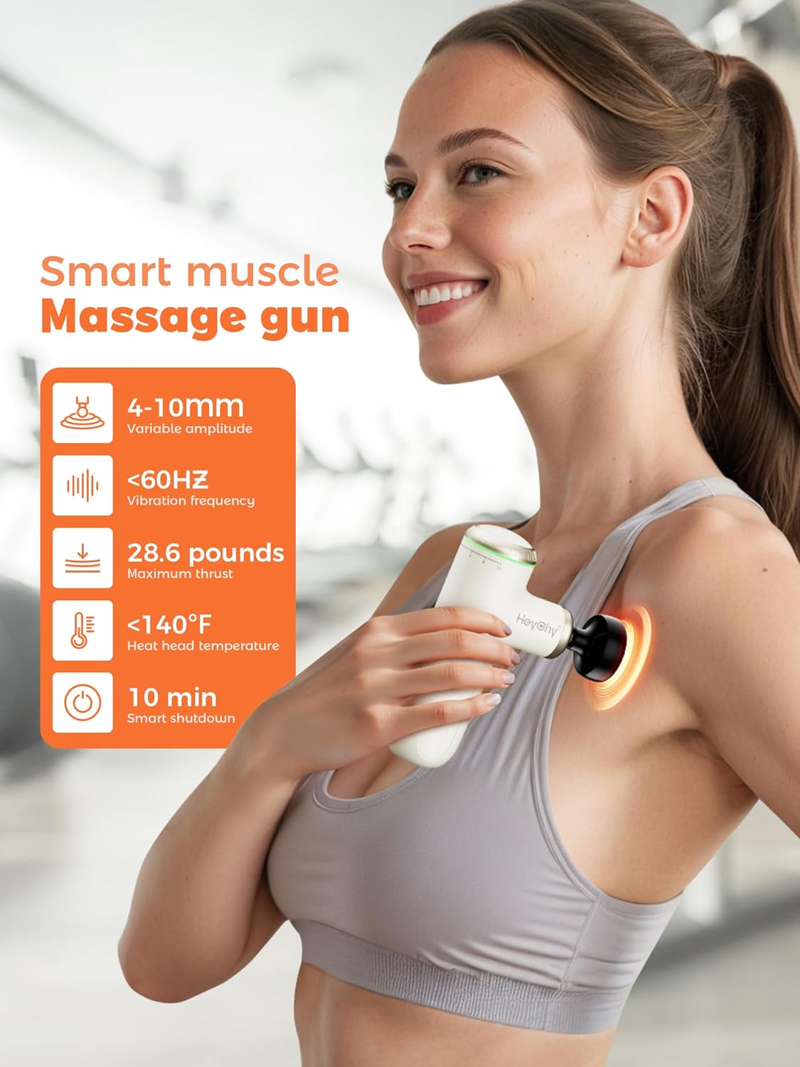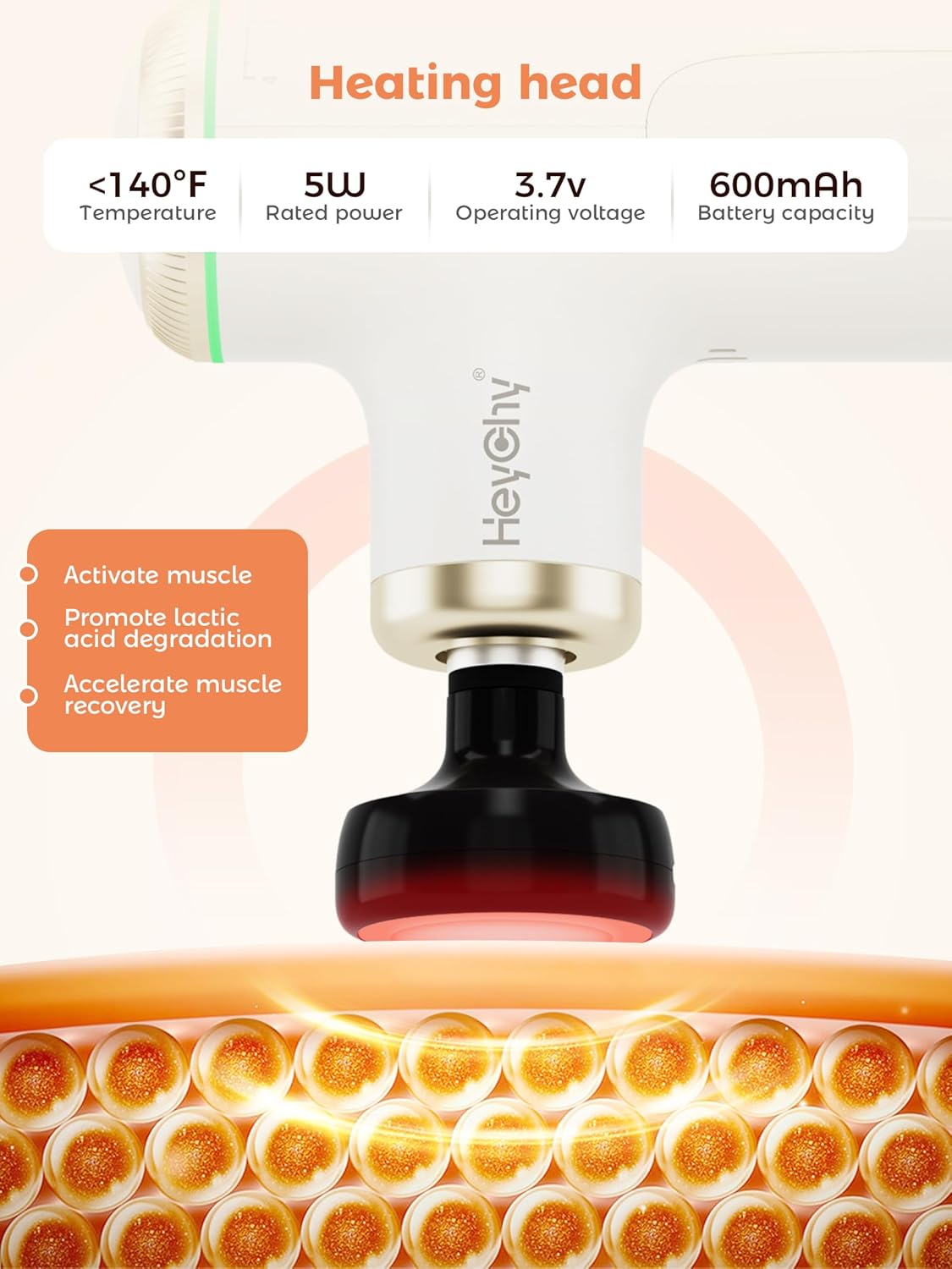 Mini Massage Gun with Heat: Mini Percussion Muscle Massager with heated massage head,warms up to 46℃/114°, the heat reaches the fascia layer directly to promote deeper muscle relaxation and stress relief