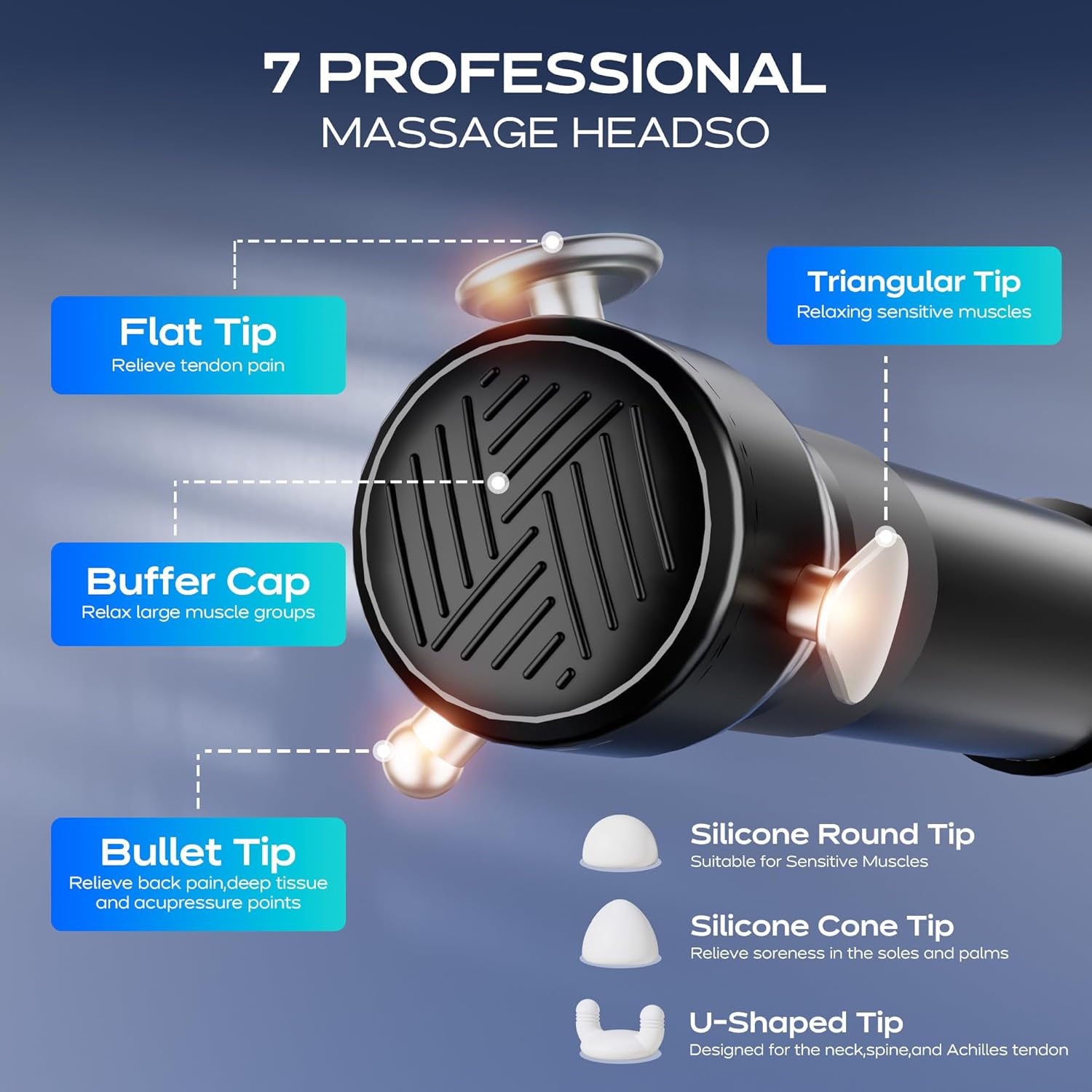 7 Massage Heads: OLEY Massage Gun comes with 4 built-in therapy heads and 3 interchangeable silicone massage heads, Includes a metal bullet tip for soothing lower back, trigger points, and knots, a metal flat tip and triangular tip for tendons and major muscle groups, a silicone round tip for large muscles, a silicone cone heads for acupoints, soles of feet, and palms, and a silicone U-shaped heads for neck, spine, and Achilles tendon, the buffer cover is almost suitable for application on any body part