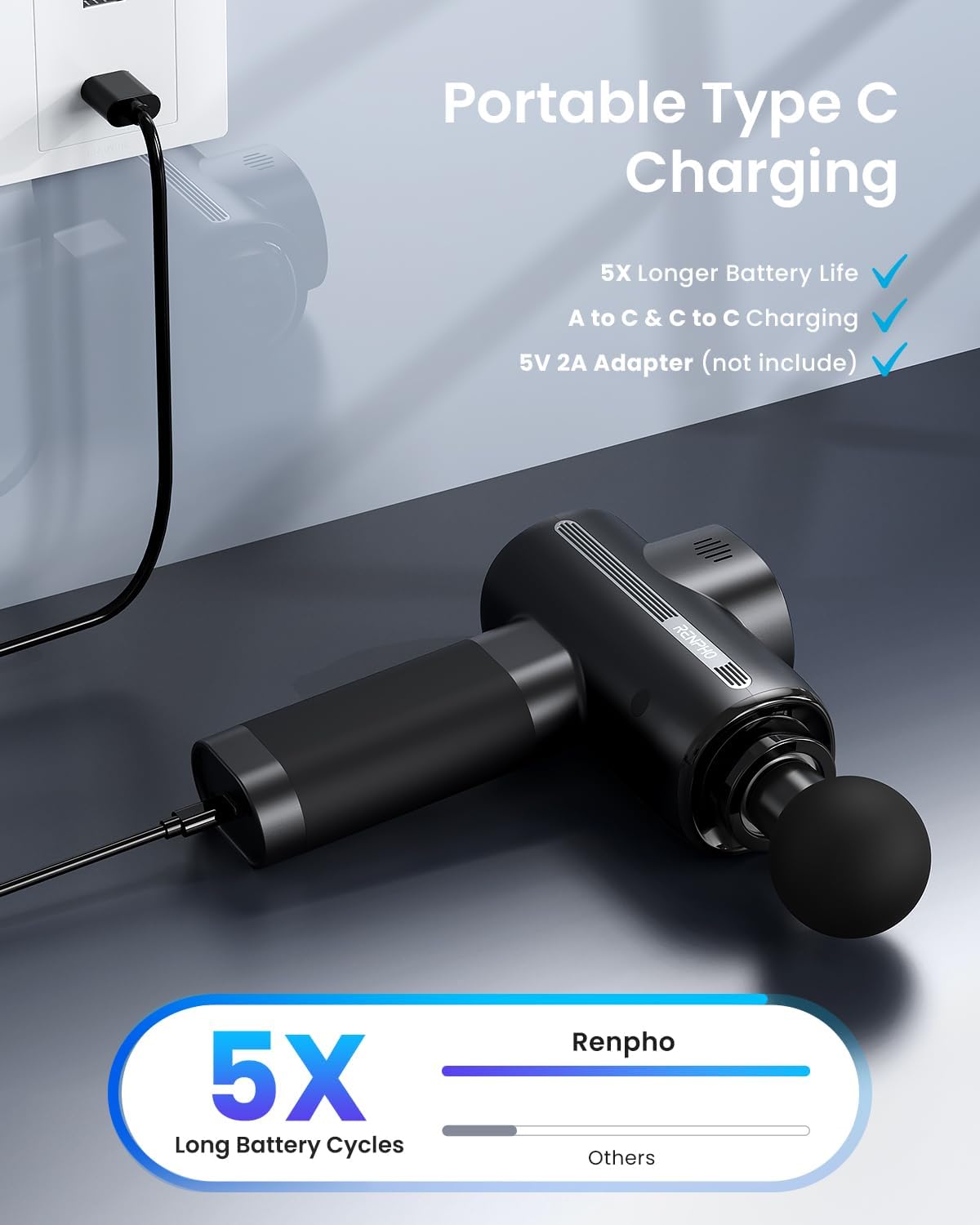 Portable Type-C Charging: Compatible with A-C and C-C charging, this portable body mini massager gun can be charged by USB with a 5 V /2 A adapter (Not Included), and can be charged by power bank or car charger too; Convenient for travel and outdoor use