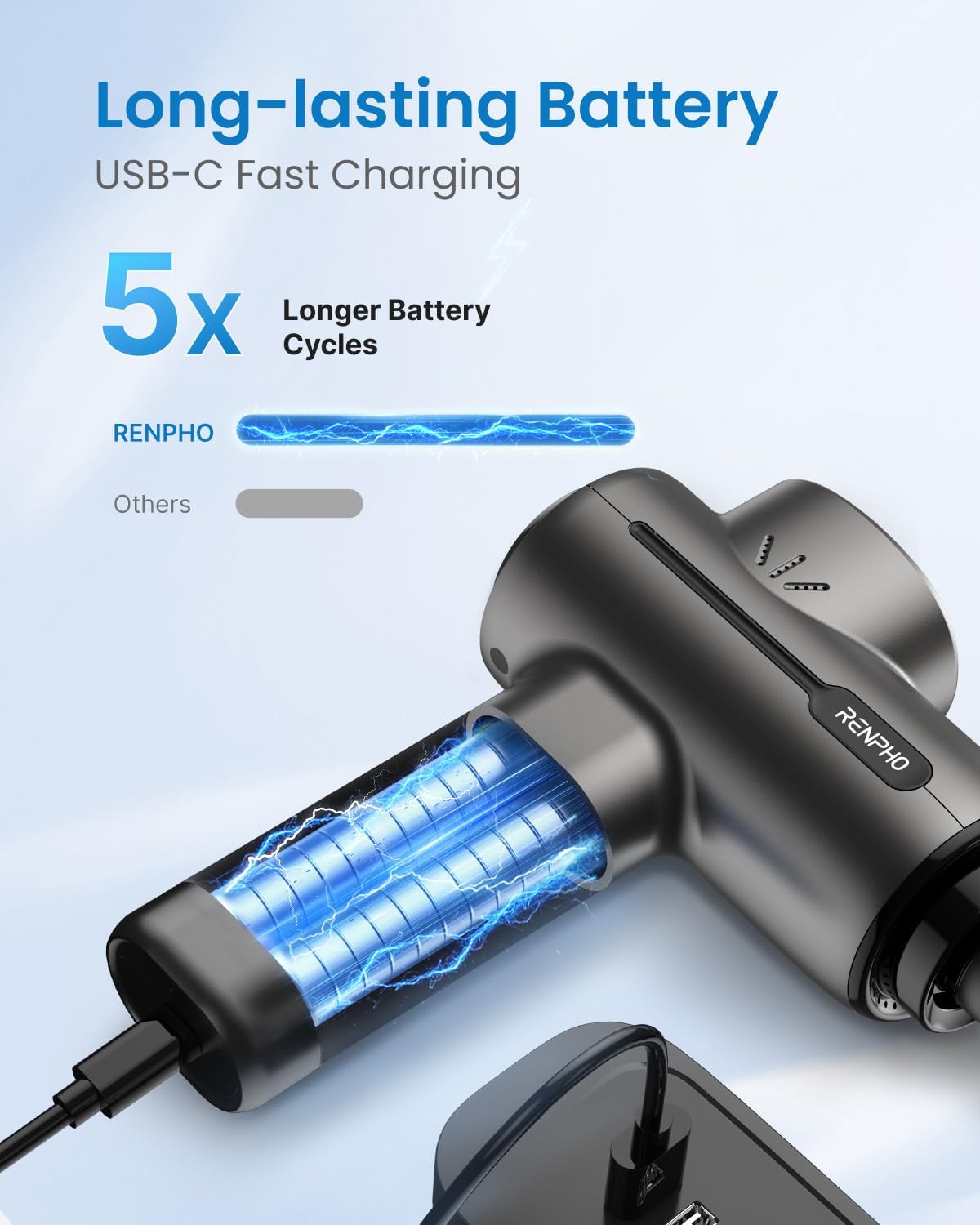 Convenient USB-Type C Charging: No need to worry about charging when traveling, this rechargeable massager gun can be charged using a 5V/2A adapter (not included) or a power bank. Ensure to fully charge the massager before its initial use