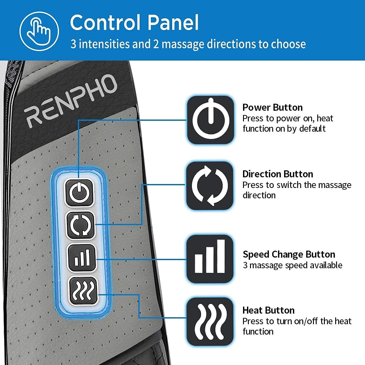 Soothing heat therapy & 3 intensity levels: Heating on massage rollers give your body warmth and improve your blood circulation while relaxing tense muscles. 15 mins intelligent auto-off timer and overheat protection system bring you hassle-free safety though you forget to turn handheld massage pillow off. 3-speed strength pressure levels target the specific areas of your body that need relief the most. Bi-directional movement optional making it an excellent value