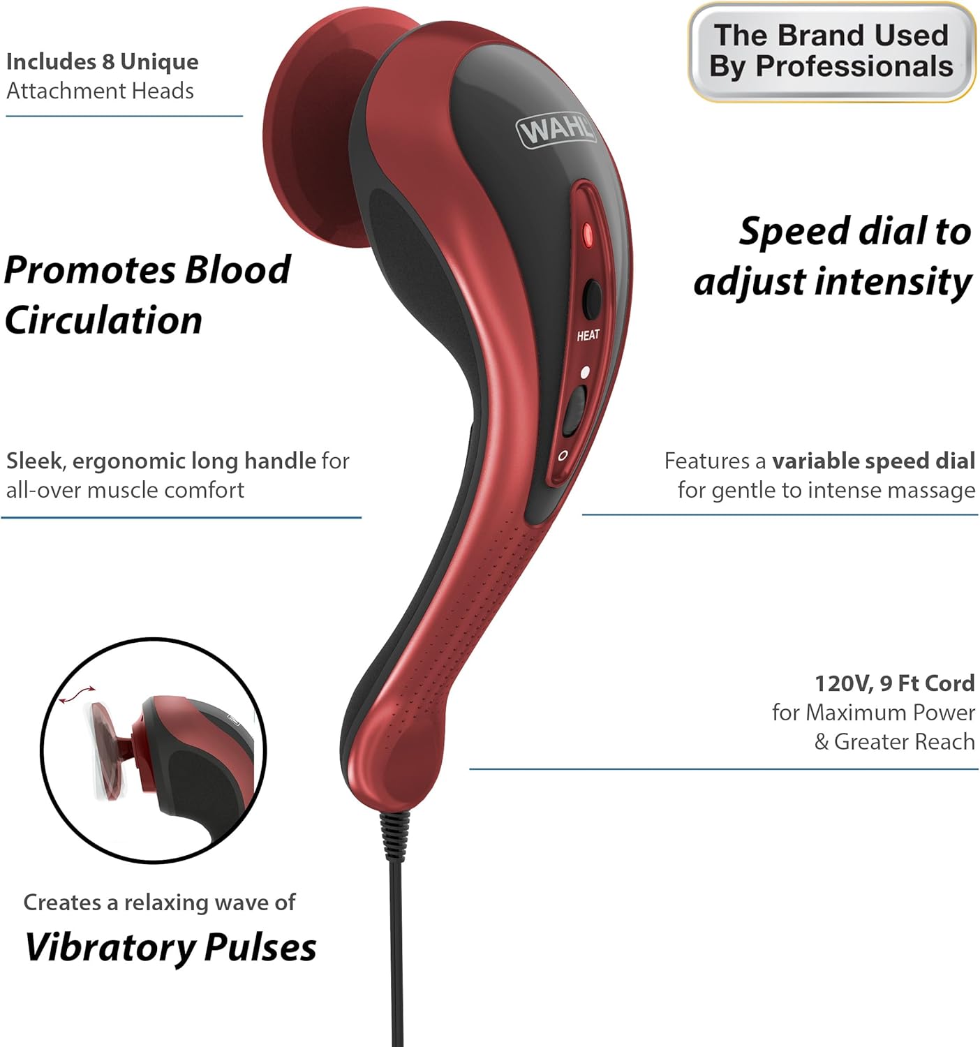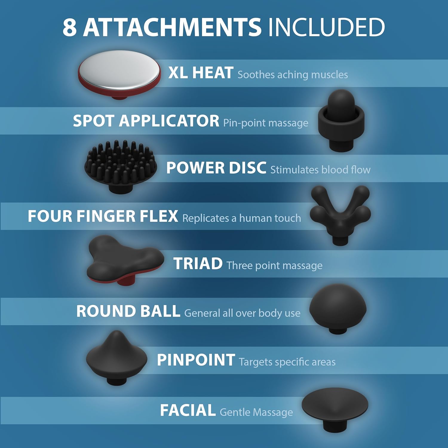 8 Unique Attachment Heads: Featuring a wide variety of attachments for various styles of massage; Triad, Heat, Round Ball, Pinpoint, Four Finger Flex, Facial, Power Disc, and Soft Applicator