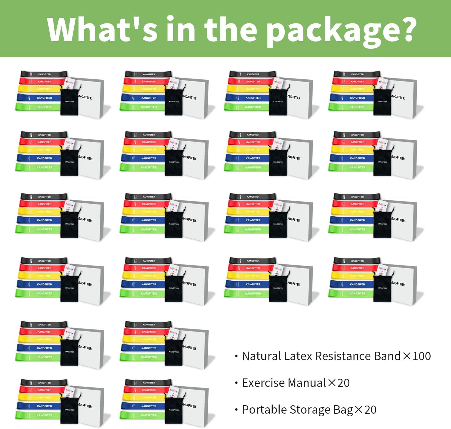 【WHAT YOU GET】: 100 Pcs KANGFITER resistance bands,5 pieces each set with storage bag and instruction guide.They can be provided to 20 gym members or class students and are suitable for group fitness exercises both indoors and outdoors.