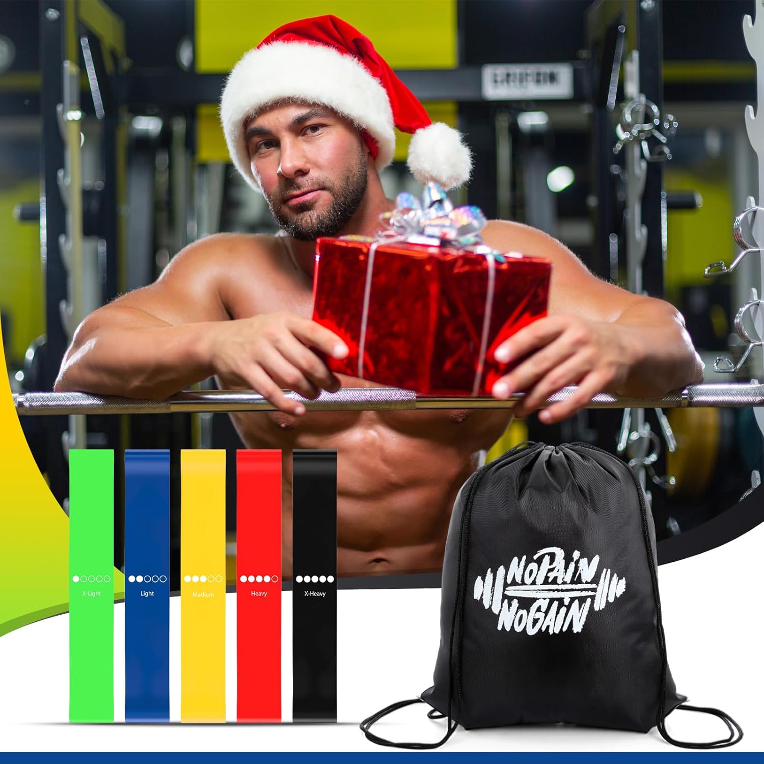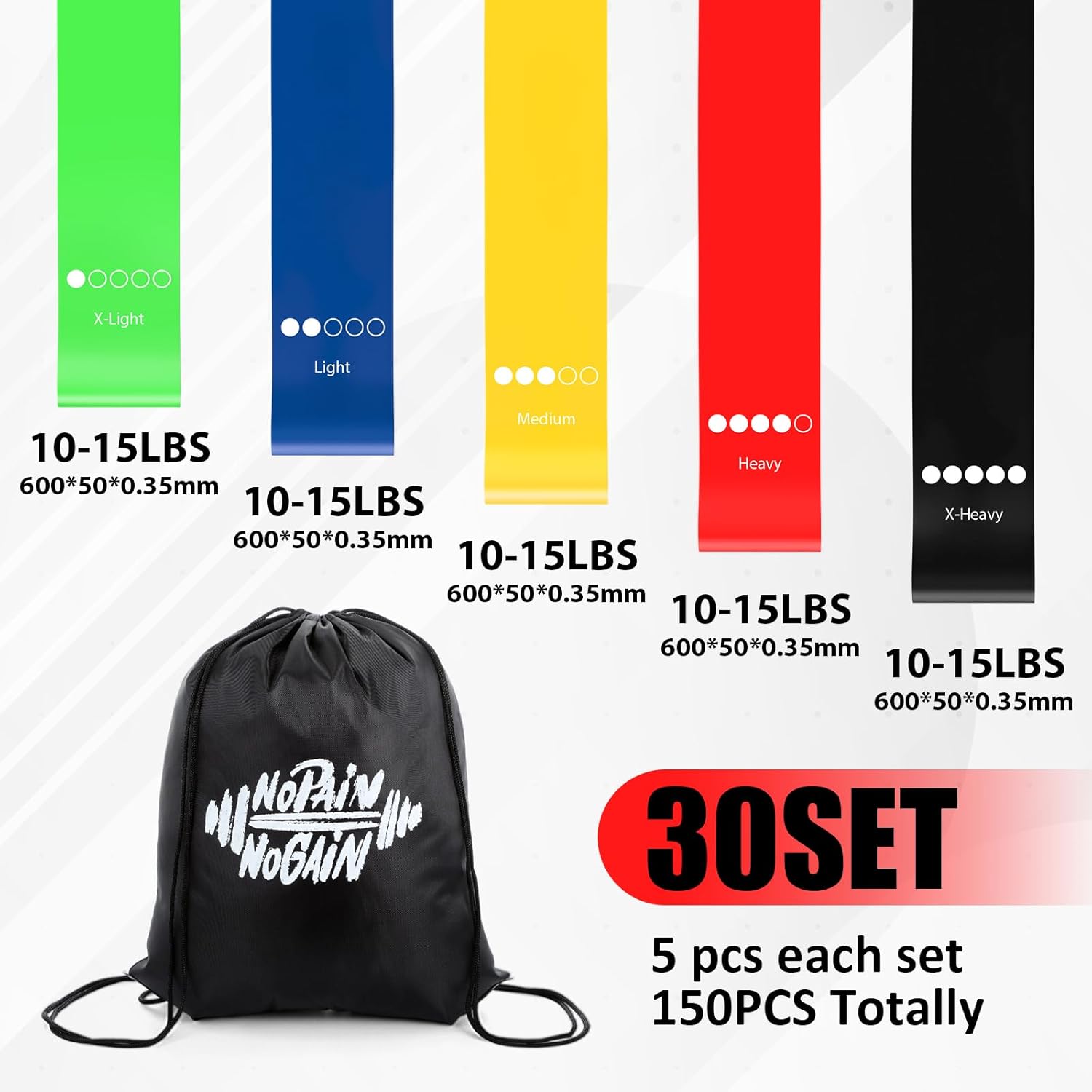 What You Get: 150 resistance bands, 5 resistance rings of different weight levels per set, 30 sets in total, with a storage bag and instruction guide; Also included are 30 drawstring backpacks with the inspirational word of “No pain no gain” printed on them, suitable as Christmas gifts for students